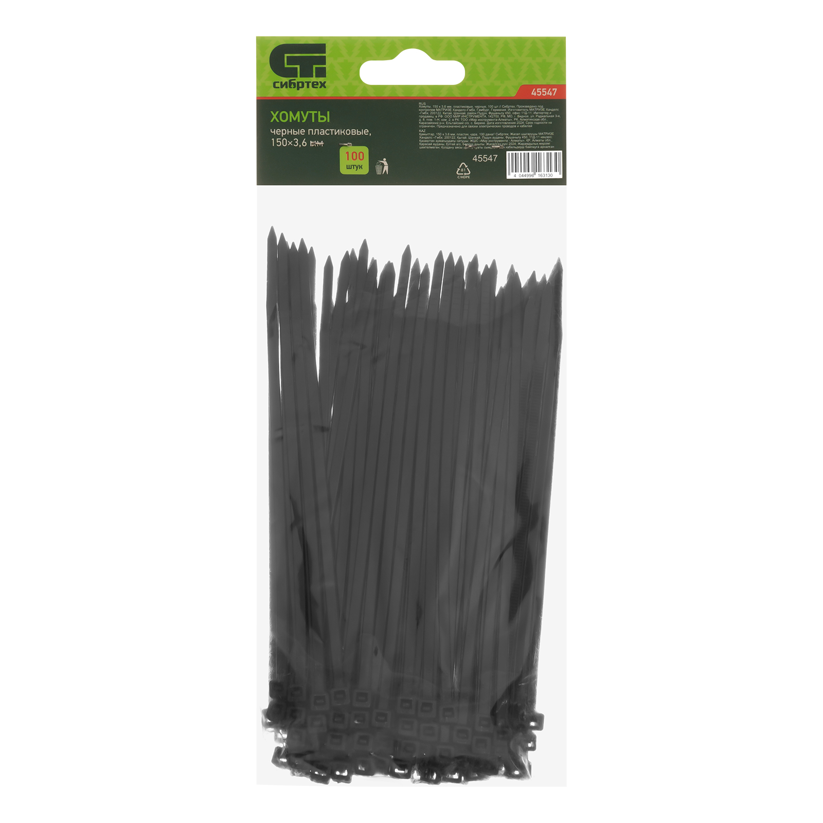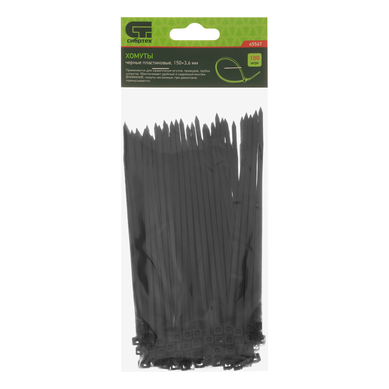 <p>Черные пластиковые хомуты Сибртех 45547, 150 х 3,6 мм, 100 шт. в упаковке, используются для стяжки кабелей, закрепления трубок, шлангов, рекламных конструкций, а также для упаковки различных предметов. Пригодятся во время прокладки электрических и локальных вычислительных сетей, ремонта компьютерной техники, оформлении торговых стендов, комплектовании товара, будут также полезны дома, на даче и в гараже.</p><h2>Преимущества</h2><ul><li>Надежные соединения — кабельные стяжки изготовлены из прочного нейлона.</li><li>Возможность проведения наружных работ — хомуты устойчивы к ультрафиолету и сохраняют свои свойства при температуре от -35 до +85 ℃.</li><li>100 штук в упаковке — набора хватит надолго.</li></ul>