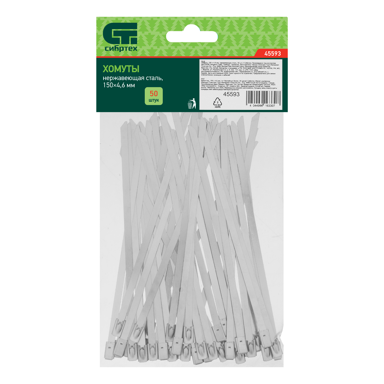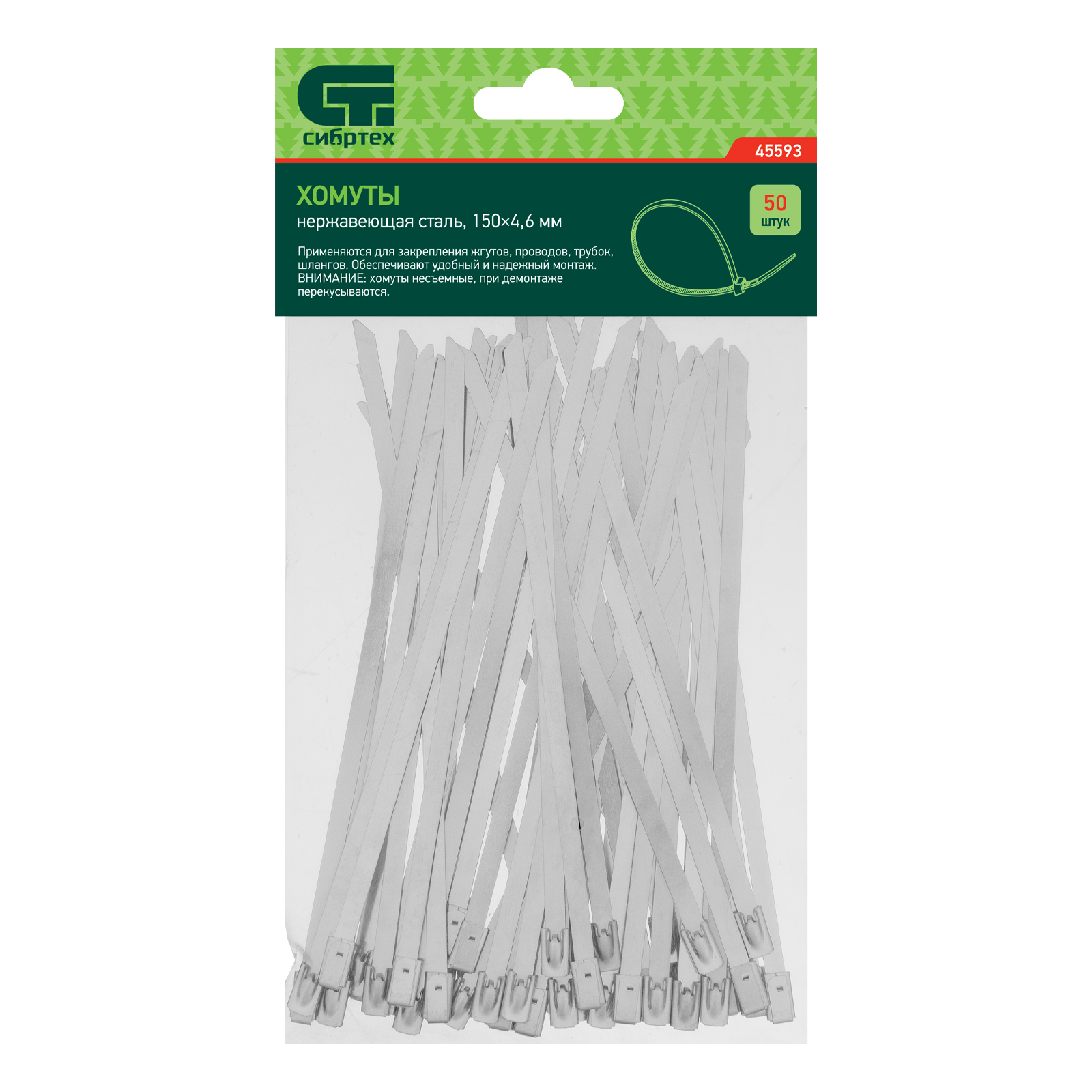 <p>Хомуты Сибртех 45593 из нержавеющей стали, размером 150 х 4,6 мм, 50 шт. в упаковке, предназначены для стяжки и закрепления проводов, жгутов, трубок и шлангов. Пригодятся во время монтажа электросетей, а также будут полезны дома, на даче или в гараже.</p><h2>Преимущества</h2><ul><li>Прочность и долговечность — хомуты изготовлены из нержавеющей стали и устойчивы к образованию коррозии.</li><li>Возможность проведения наружных работ — стяжки нечувствительны к ультрафиолету и сохраняют рабочие свойства при температуре от -50 до +150 ℃.</li><li>Удобная комплектация — в наборе 50 хомутов, которых хватит для выполнения большого объема работ.</li></ul>