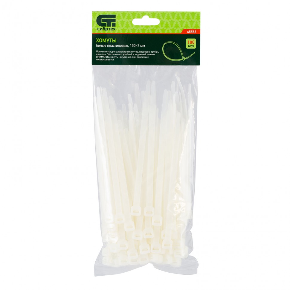 <p>Белые пластиковые хомуты Сибртех 45553, 150 х 7 мм, 100 шт. в упаковке, используются для стяжки кабелей, закрепления трубок, шлангов, рекламных конструкций, а также для упаковки различных предметов. Пригодятся во время прокладки электрических и локальных вычислительных сетей, ремонта компьютерной техники, оформлении торговых стендов, комплектовании товара, будут также полезны дома, на даче и в гараже.</p><h2>Преимущества</h2><ul><li>Надежные соединения — кабельные стяжки изготовлены из прочного нейлона.</li><li>Возможность проведения наружных работ — хомуты устойчивы к ультрафиолету и сохраняют свои свойства при температуре от -35 до +85 ℃.</li><li>100 штук в упаковке — набора хватит надолго.</li></ul>