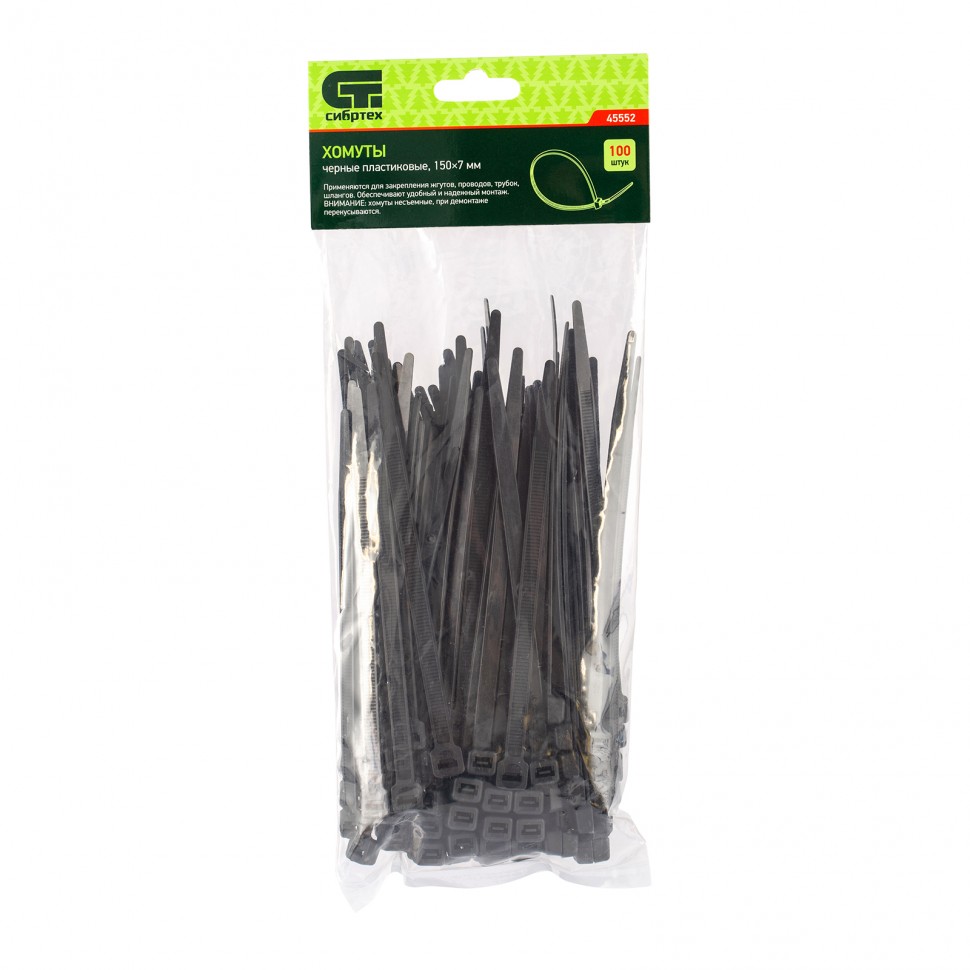 <p>Черные пластиковые хомуты Сибртех 45552, 150 х 7 мм, 100 шт. в упаковке, используются для стяжки кабелей, закрепления трубок, шлангов, рекламных конструкций, а также для упаковки различных предметов. Пригодятся во время прокладки электрических и локальных вычислительных сетей, ремонта компьютерной техники, оформлении торговых стендов, комплектовании товара, будут также полезны дома, на даче и в гараже.</p><h2>Преимущества</h2><ul><li>Надежные соединения — кабельные стяжки изготовлены из прочного нейлона.</li><li>Возможность проведения наружных работ — хомуты устойчивы к ультрафиолету и сохраняют свои свойства при температуре от -35 до +85 ℃.</li><li>100 штук в упаковке — набора хватит надолго.</li></ul>
