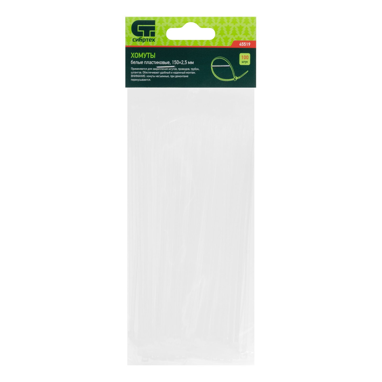 <p>Белые пластиковые хомуты Сибртех 45519, 150 х 2,5 мм, 100 шт. в упаковке, используются для стяжки кабелей, закрепления трубок, шлангов, рекламных конструкций, а также для упаковки различных предметов. Пригодятся во время прокладки электрических и локальных вычислительных сетей, ремонта компьютерной техники, оформлении торговых стендов, комплектовании товара, будут также полезны дома, на даче и в гараже.</p><h2>Преимущества</h2><ul><li>Надежные соединения — кабельные стяжки изготовлены из прочного нейлона.</li><li>Возможность проведения наружных работ — хомуты устойчивы к ультрафиолету и сохраняют свои свойства при температуре от -35 до +85 ℃.</li><li>100 штук в упаковке — набора хватит надолго.</li></ul>