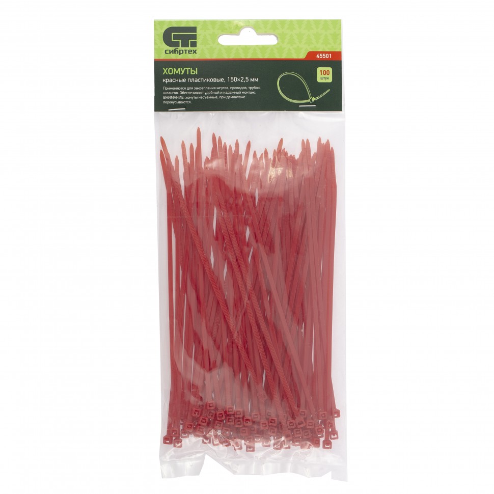 <p>Красные пластиковые хомуты Сибртех 45501, 150 х 2,5 мм, 100 шт. в упаковке, используются для стяжки кабелей, закрепления трубок, шлангов, рекламных конструкций, а также для упаковки различных предметов. Пригодятся во время прокладки электрических и локальных вычислительных сетей, ремонта компьютерной техники, оформлении торговых стендов, комплектовании товара, будут также полезны дома, на даче и в гараже.</p><h2>Преимущества</h2><ul><li>Надежные соединения — кабельные стяжки изготовлены из прочного нейлона.</li><li>Возможность проведения наружных работ — хомуты устойчивы к ультрафиолету и сохраняют свои свойства при температуре от -35 до +85 ℃.</li><li>100 штук в упаковке — набора хватит надолго.</li></ul>