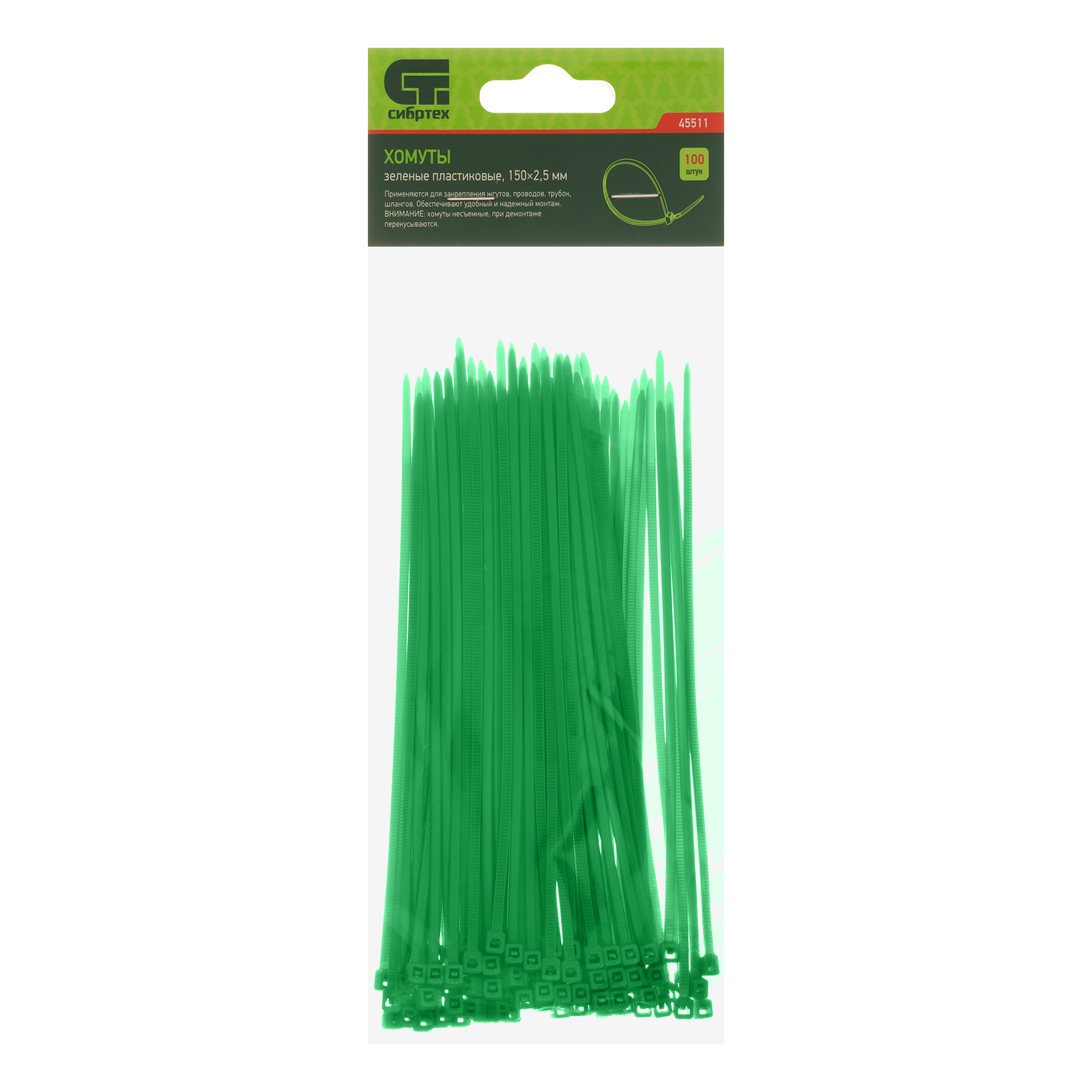 <p>Зеленые пластиковые хомуты Сибртех 45511, 150 х 2,5 мм, 100 шт. в упаковке, используются для стяжки кабелей, закрепления трубок, шлангов, рекламных конструкций, а также для упаковки различных предметов. Пригодятся во время прокладки электрических и локальных вычислительных сетей, ремонта компьютерной техники, оформлении торговых стендов, комплектовании товара, будут также полезны дома, на даче и в гараже.</p><h2>Преимущества</h2><ul><li>Надежные соединения — кабельные стяжки изготовлены из прочного нейлона.</li><li>Возможность проведения наружных работ — хомуты устойчивы к ультрафиолету и сохраняют свои свойства при температуре от -35 до +85 ℃.</li><li>100 штук в упаковке — набора хватит надолго.</li></ul>