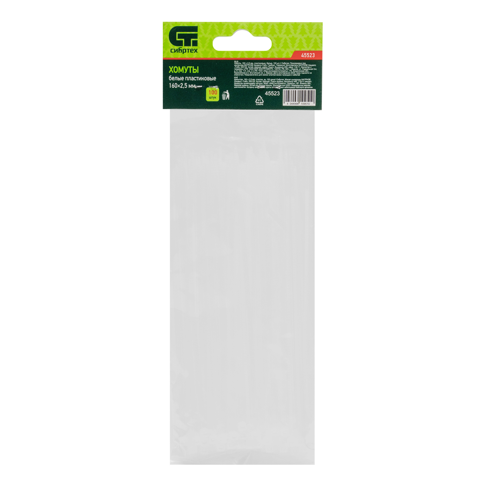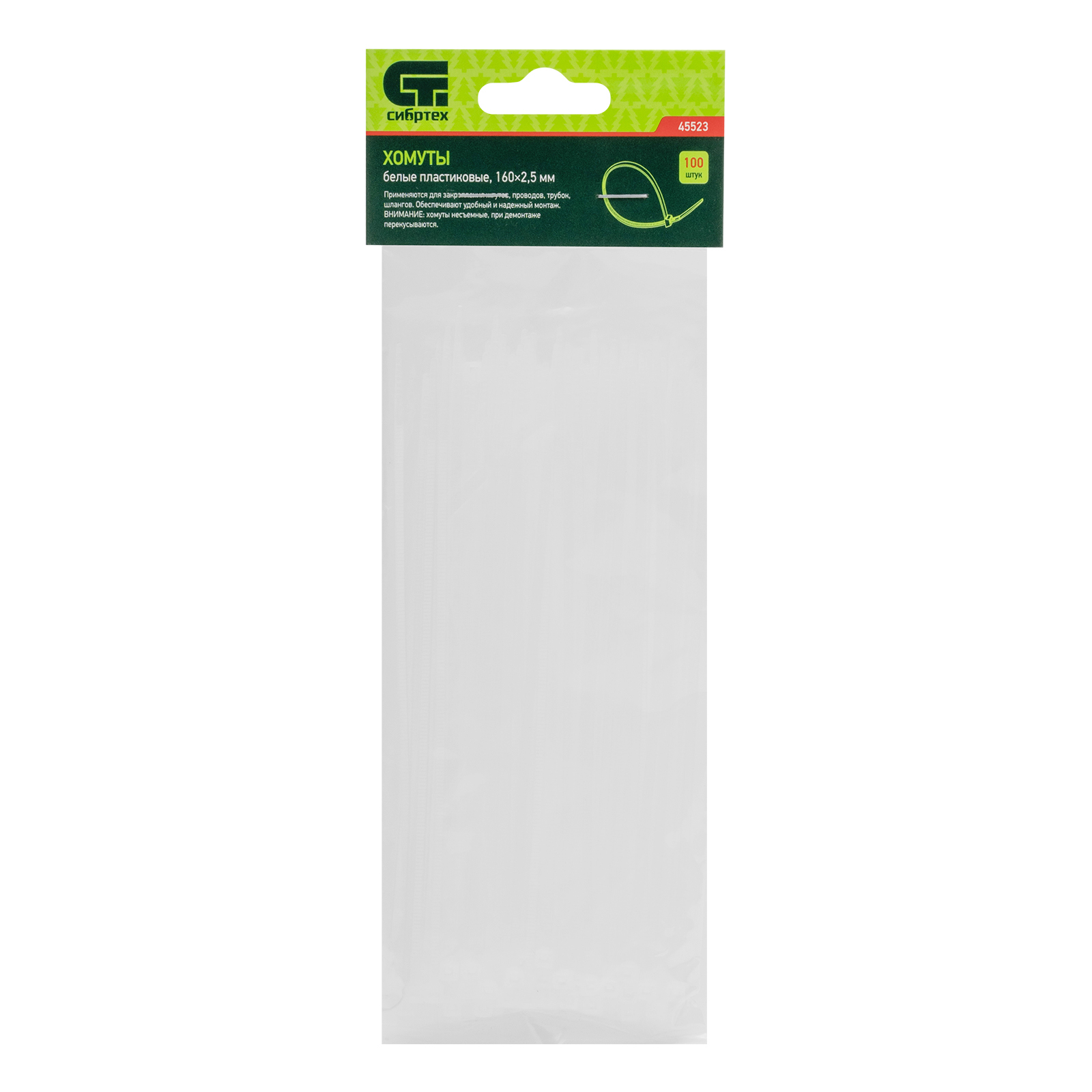 <p>Белые пластиковые хомуты Сибртех 45523, 160 х 2,5 мм, 100 шт. в упаковке, используются для стяжки кабелей, закрепления трубок, шлангов, рекламных конструкций, а также для упаковки различных предметов. Пригодятся во время прокладки электрических и локальных вычислительных сетей, ремонта компьютерной техники, оформлении торговых стендов, комплектовании товара, будут также полезны дома, на даче и в гараже.</p><h2>Преимущества</h2><ul><li>Надежные соединения — кабельные стяжки изготовлены из прочного нейлона.</li><li>Возможность проведения наружных работ — хомуты устойчивы к ультрафиолету и сохраняют свои свойства при температуре от -35 до +85 ℃.</li><li>100 штук в упаковке — набора хватит надолго.</li></ul>