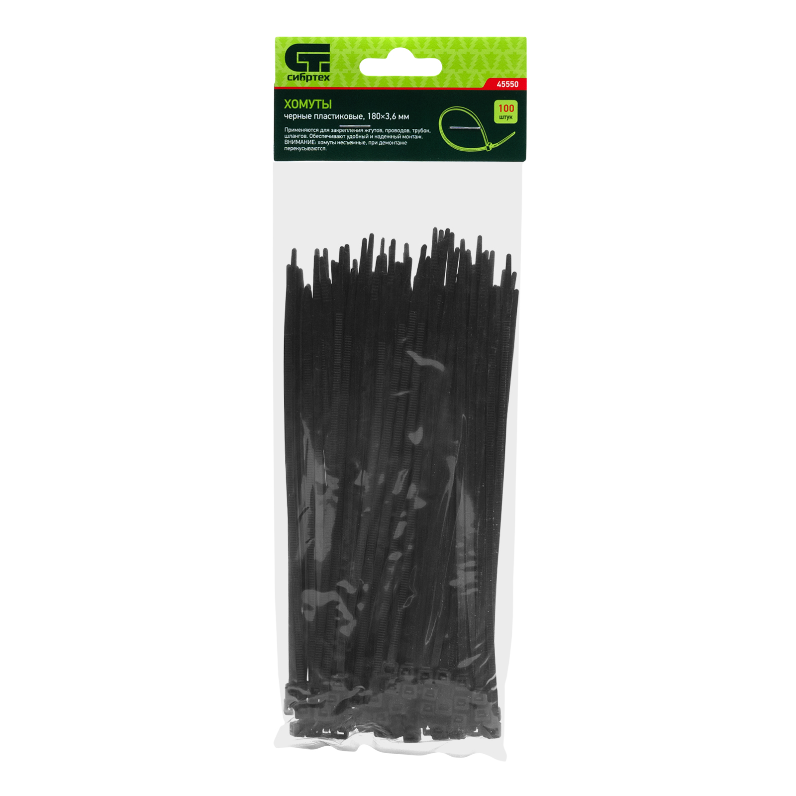 Черные пластиковые хомуты Сибртех 45550, 180 х 3,6 мм, 100 шт. в упаковке, используются для стяжки кабелей, закрепления трубок, шлангов, рекламных конструкций, а также для упаковки различных предметов. Пригодятся во время прокладки электрических и локальных вычислительных сетей, ремонта компьютерной техники, оформлении торговых стендов, комплектовании товара, будут также полезны дома, на даче и в гараже.