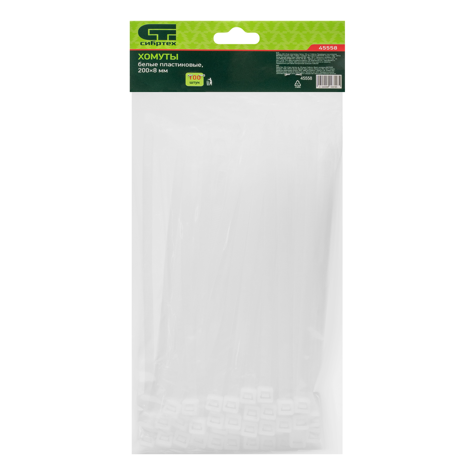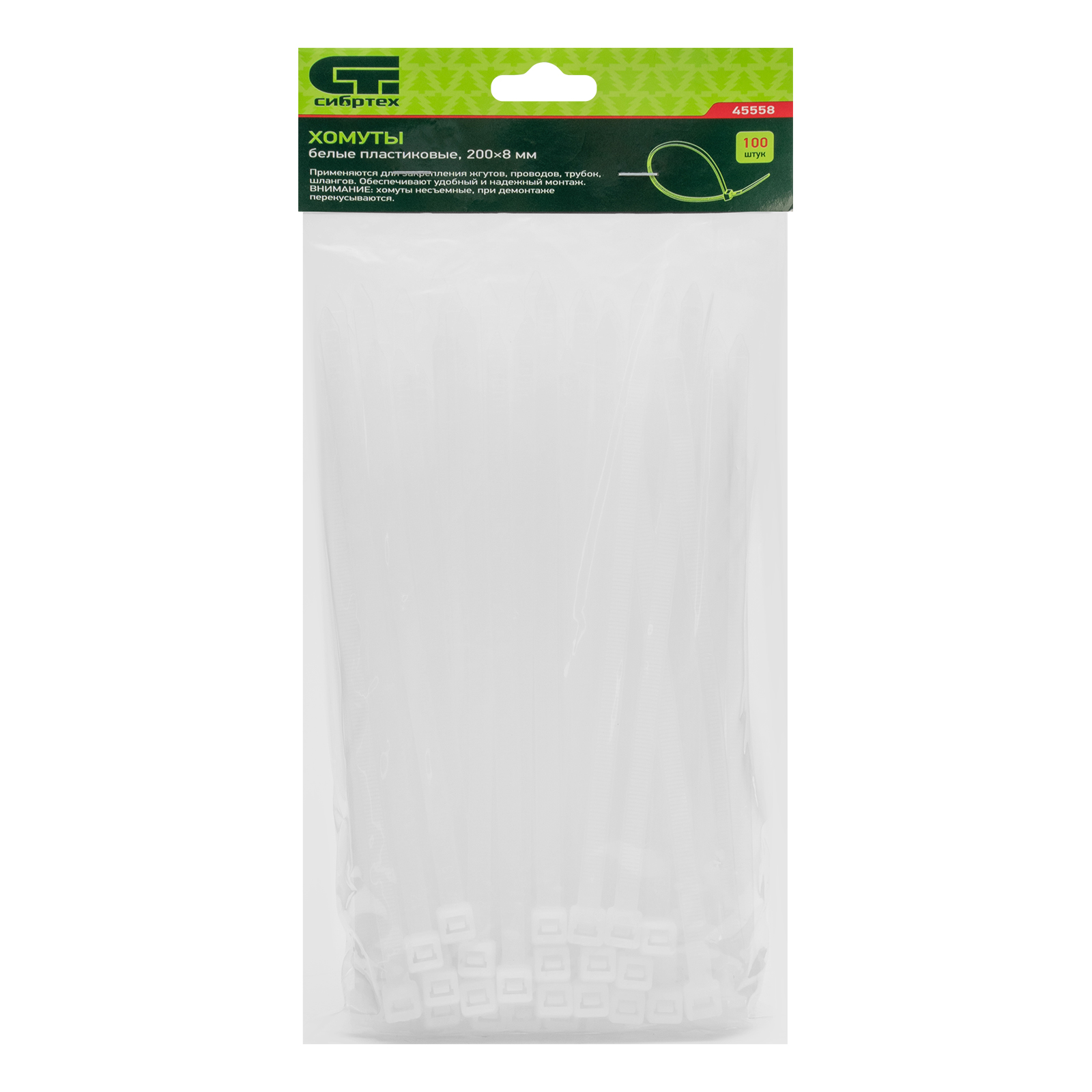 <p>Белые пластиковые хомуты Сибртех 45558, 200 х 8 мм, 100 шт. в упаковке, используются для стяжки кабелей, закрепления трубок, шлангов, рекламных конструкций, а также для упаковки различных предметов. Пригодятся во время прокладки электрических и локальных вычислительных сетей, ремонта компьютерной техники, оформлении торговых стендов, комплектовании товара, будут также полезны дома, на даче и в гараже.</p><h2>Преимущества</h2><ul><li>Надежные соединения — кабельные стяжки изготовлены из прочного нейлона.</li><li>Возможность проведения наружных работ — хомуты устойчивы к ультрафиолету и сохраняют свои свойства при температуре от -35 до +85 ℃.</li><li>100 штук в упаковке — набора хватит надолго.</li></ul>