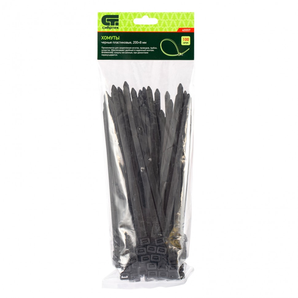 <p>Черные пластиковые хомуты Сибртех 45557, 200 х 8 мм, 100 шт. в упаковке, используются для стяжки кабелей, закрепления трубок, шлангов, рекламных конструкций, а также для упаковки различных предметов. Пригодятся во время прокладки электрических и локальных вычислительных сетей, ремонта компьютерной техники, оформлении торговых стендов, комплектовании товара, будут также полезны дома, на даче и в гараже.</p><h2>Преимущества</h2><ul><li>Надежные соединения — кабельные стяжки изготовлены из прочного нейлона.</li><li>Возможность проведения наружных работ — хомуты устойчивы к ультрафиолету и сохраняют свои свойства при температуре от -35 до +85 ℃.</li><li>100 штук в упаковке — набора хватит надолго.</li></ul>