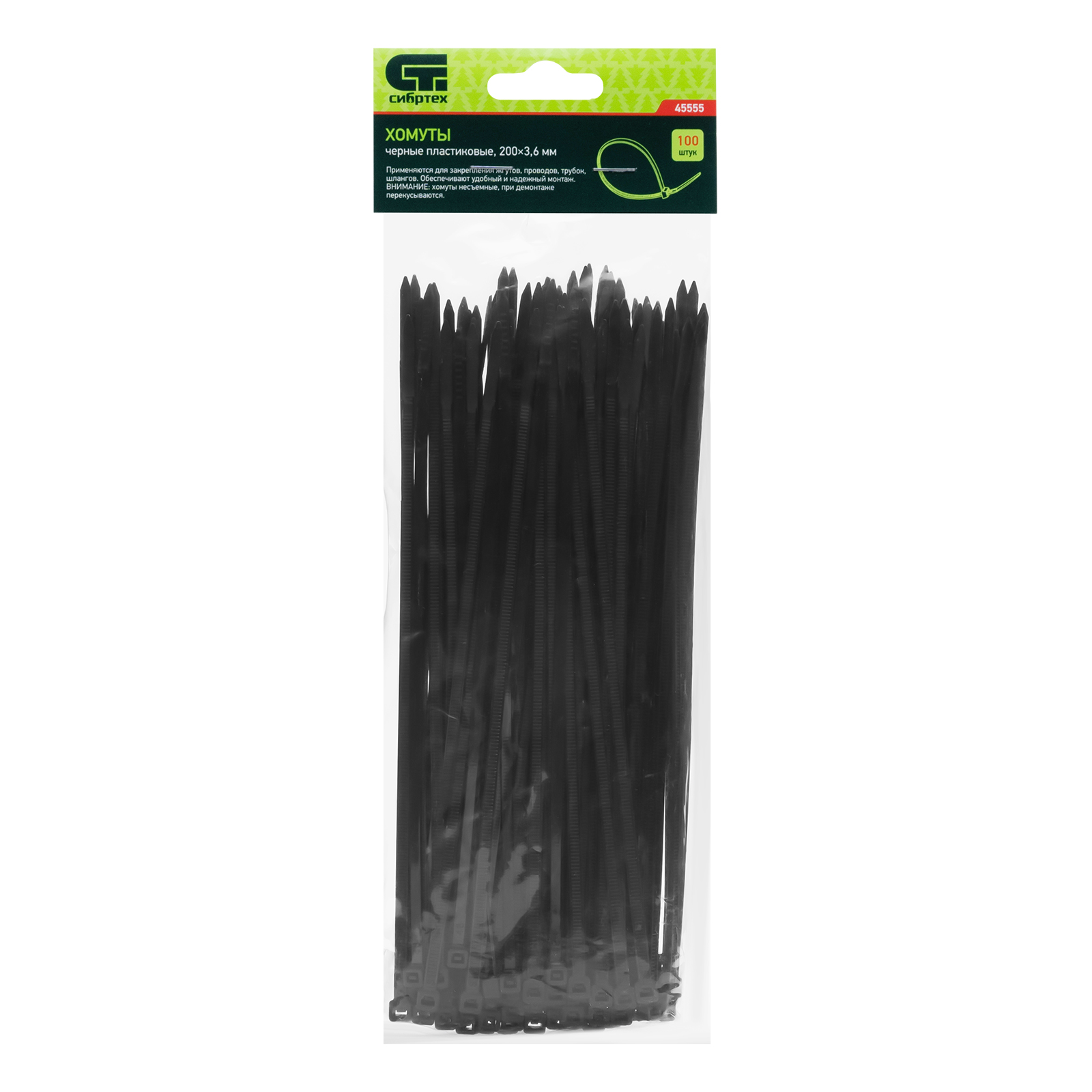 Черные пластиковые хомуты Сибртех 45555, 200 х 3,6 мм, 100 шт. в упаковке, используются для стяжки кабелей, закрепления трубок, шлангов, рекламных конструкций, а также для упаковки различных предметов. Пригодятся во время прокладки электрических и локальных вычислительных сетей, ремонта компьютерной техники, оформлении торговых стендов, комплектовании товара, будут также полезны дома, на даче и в гараже.