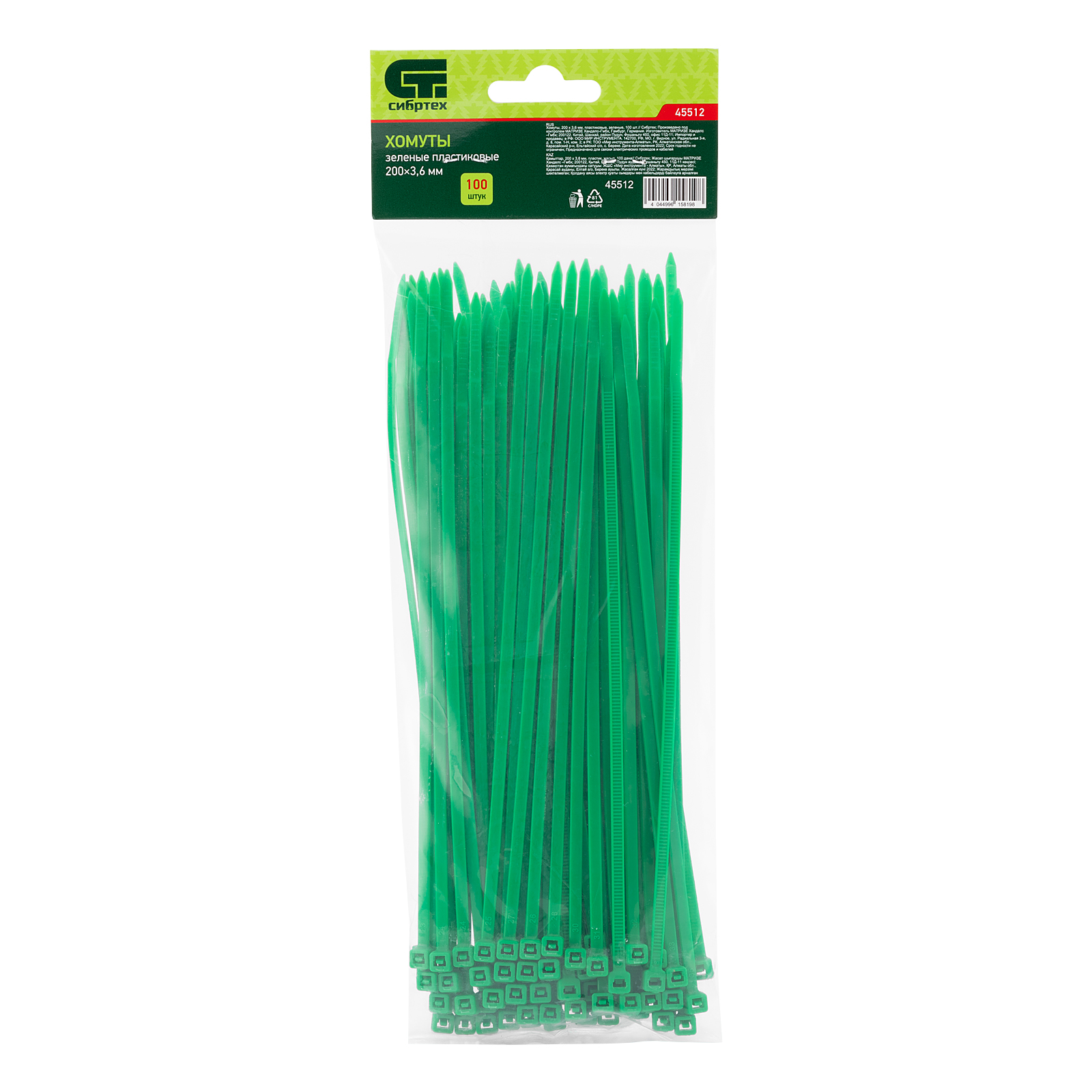 Зеленые пластиковые хомуты Сибртех 45512, 200 х 3,6 мм, 100 шт. в упаковке, используются для стяжки кабелей, закрепления трубок, шлангов, рекламных конструкций, а также для упаковки различных предметов. Пригодятся во время прокладки электрических и локальных вычислительных сетей, ремонта компьютерной техники, оформлении торговых стендов, комплектовании товара, будут также полезны дома, на даче и в гараже.