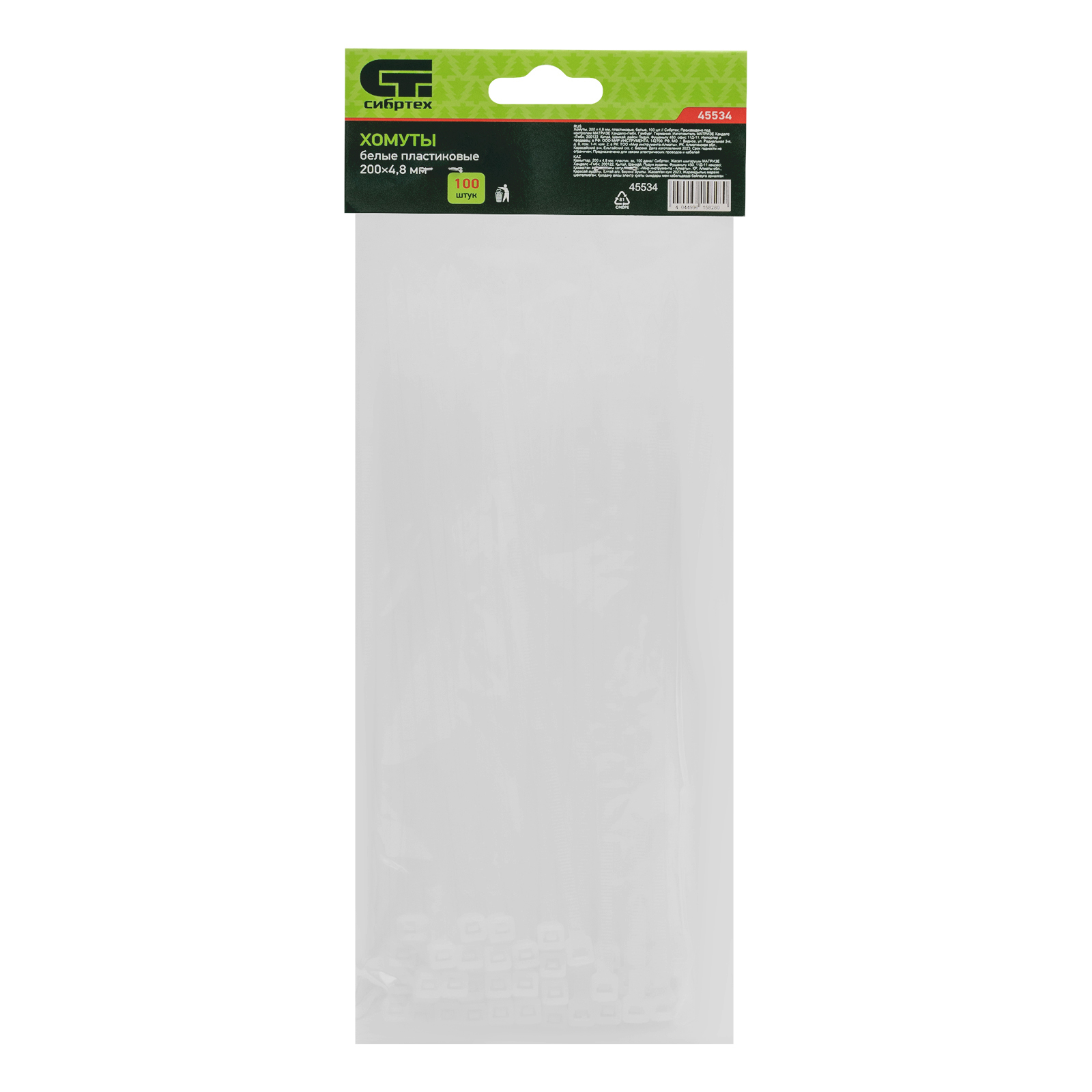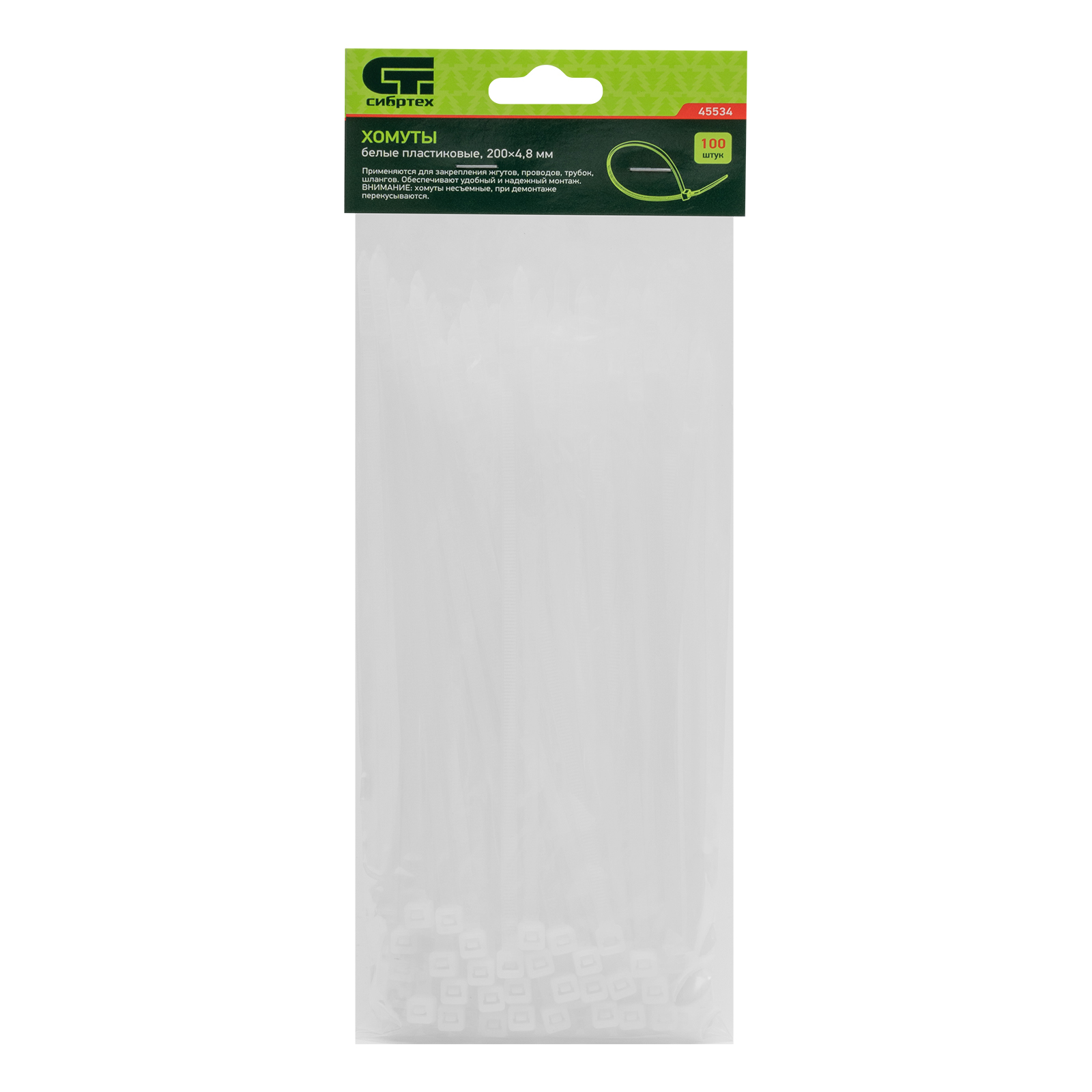 <p>Белые пластиковые хомуты Сибртех 45534, 200 х 4,8 мм, 100 шт. в упаковке, используются для стяжки кабелей, закрепления трубок, шлангов, рекламных конструкций, а также для упаковки различных предметов. Пригодятся во время прокладки электрических и локальных вычислительных сетей, ремонта компьютерной техники, оформлении торговых стендов, комплектовании товара, будут также полезны дома, на даче и в гараже.</p><h2>Преимущества</h2><ul><li>Надежные соединения — кабельные стяжки изготовлены из прочного нейлона.</li><li>Возможность проведения наружных работ — хомуты устойчивы к ультрафиолету и сохраняют свои свойства при температуре от -35 до +85 ℃.</li><li>100 штук в упаковке — набора хватит надолго.</li></ul>