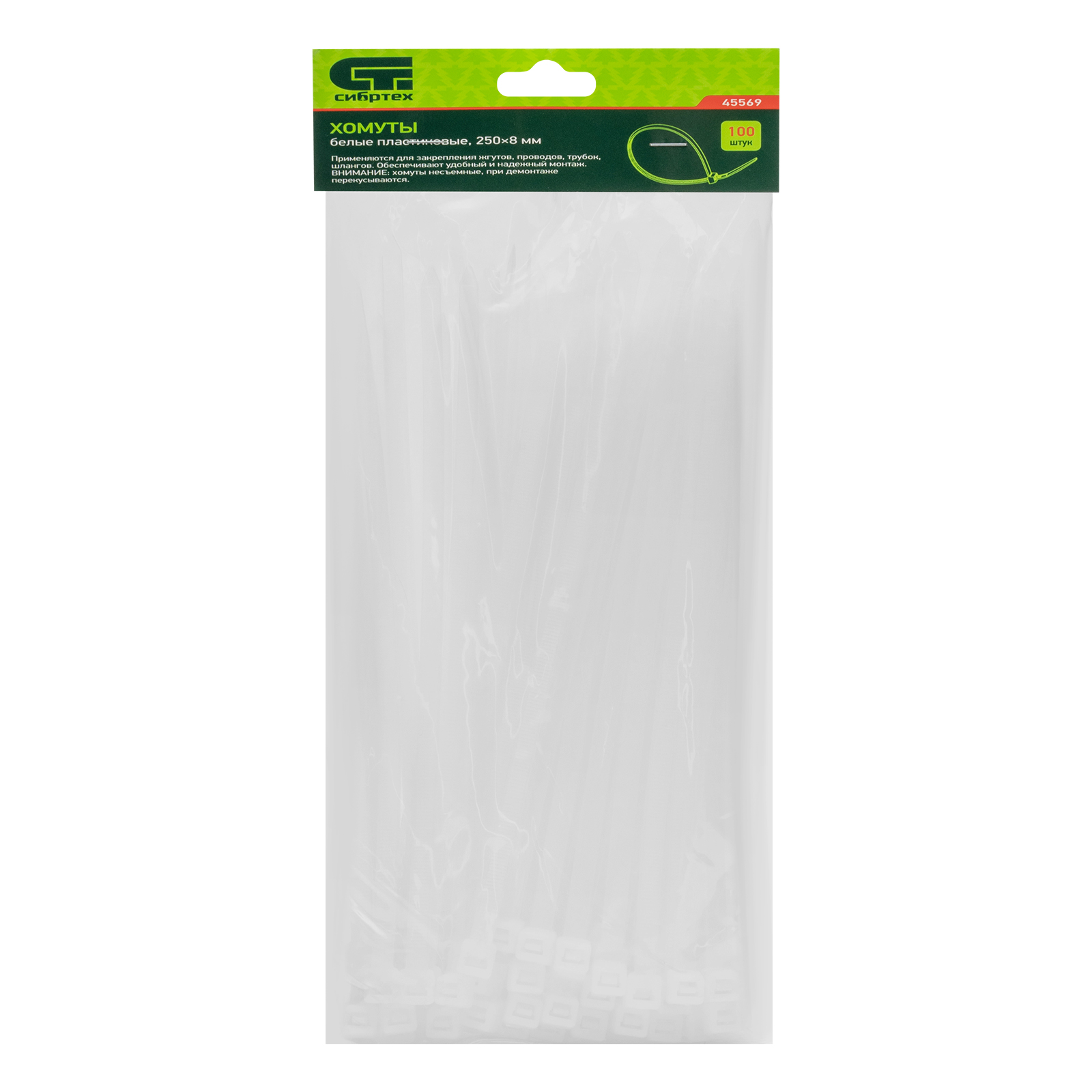 <p>Белые пластиковые хомуты Сибртех 45569, 250 х 8 мм, 100 шт. в упаковке, используются для стяжки кабелей, закрепления трубок, шлангов, рекламных конструкций, а также для упаковки различных предметов. Пригодятся во время прокладки электрических и локальных вычислительных сетей, ремонта компьютерной техники, оформлении торговых стендов, комплектовании товара, будут также полезны дома, на даче и в гараже.</p><h2>Преимущества</h2><ul><li>Надежные соединения — кабельные стяжки изготовлены из прочного нейлона.</li><li>Возможность проведения наружных работ — хомуты устойчивы к ультрафиолету и сохраняют свои свойства при температуре от -35 до +85 ℃.</li><li>100 штук в упаковке — набора хватит надолго.</li></ul>