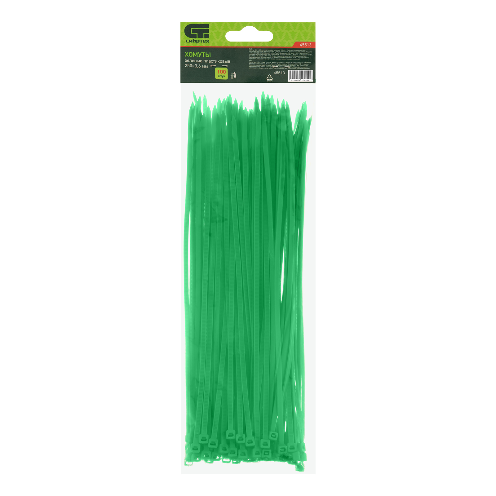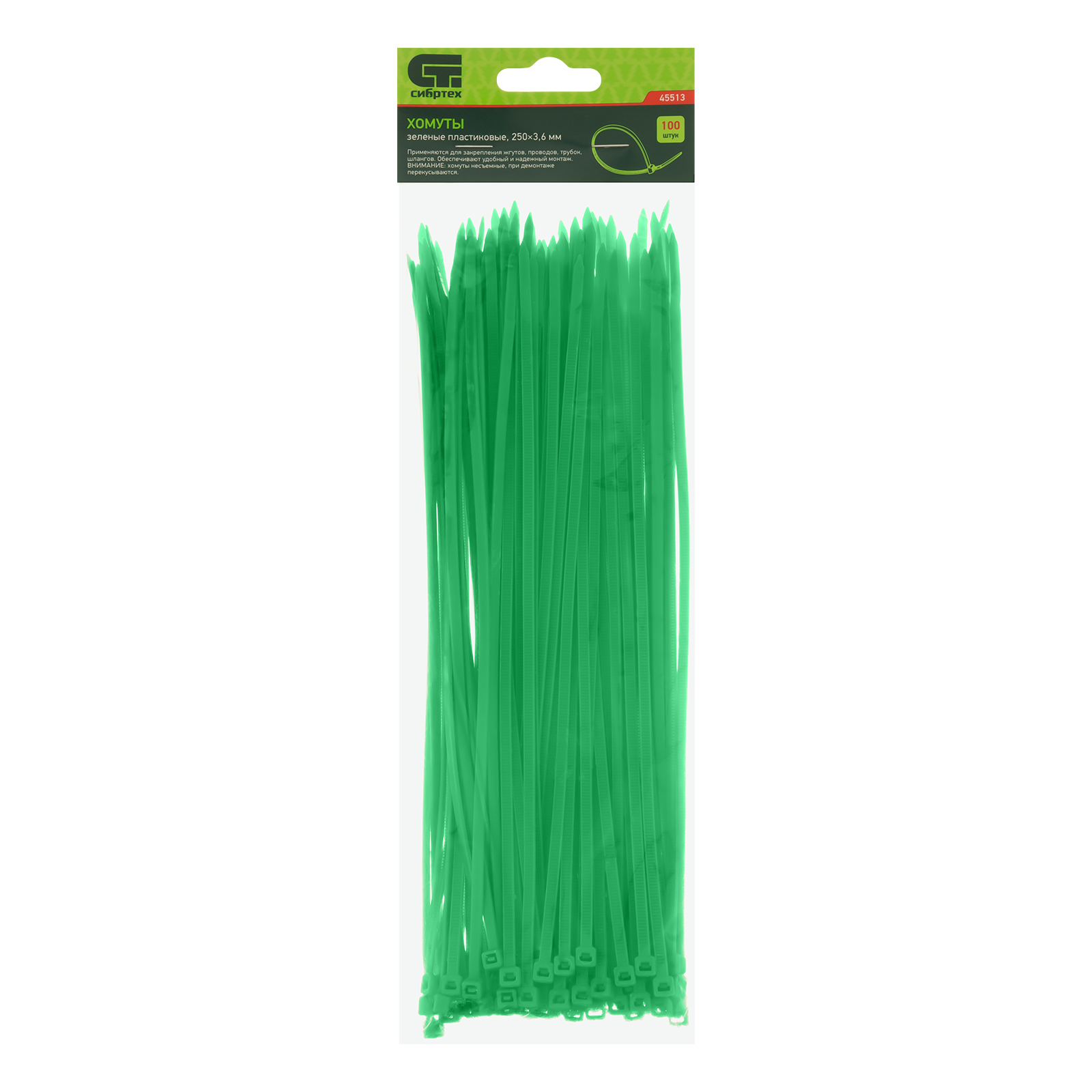 <p>Зеленые пластиковые хомуты Сибртех 45513, 250 х 3,6 мм, 100 шт. в упаковке, используются для стяжки кабелей, закрепления трубок, шлангов, рекламных конструкций, а также для упаковки различных предметов. Пригодятся во время прокладки электрических и локальных вычислительных сетей, ремонта компьютерной техники, оформлении торговых стендов, комплектовании товара, будут также полезны дома, на даче и в гараже.</p><h2>Преимущества</h2><ul><li>Надежные соединения — кабельные стяжки изготовлены из прочного нейлона.</li><li>Возможность проведения наружных работ — хомуты устойчивы к ультрафиолету и сохраняют свои свойства при температуре от -35 до +85 ℃.</li><li>100 штук в упаковке — набора хватит надолго.</li></ul>