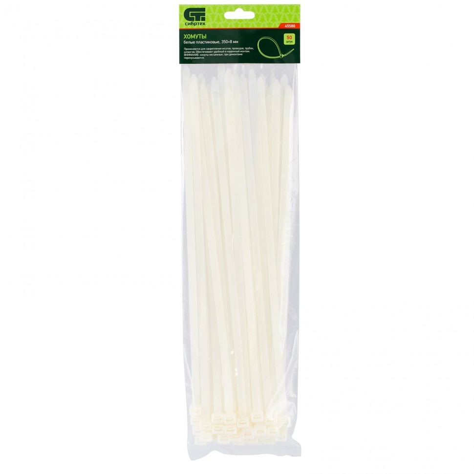 <p>Белые пластиковые хомуты Сибртех 45580, 350 х 8 мм, 50 шт. в упаковке, используются для стяжки кабелей, закрепления трубок, шлангов, рекламных конструкций, а также для упаковки различных предметов. Пригодятся во время прокладки электрических и локальных вычислительных сетей, ремонта компьютерной техники, оформлении торговых стендов, комплектовании товара, будут также полезны дома, на даче и в гараже.</p><h2>Преимущества</h2><ul><li>Надежные соединения — кабельные стяжки изготовлены из прочного нейлона.</li><li>Возможность проведения наружных работ — хомуты устойчивы к ультрафиолету и сохраняют свои свойства при температуре от -35 до +85 ℃.</li><li>50 штук в упаковке — набора хватит надолго.</li></ul>