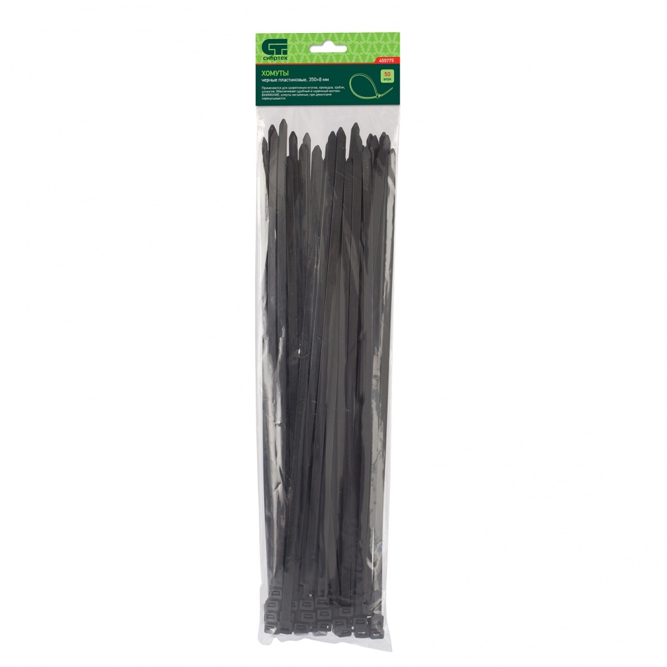 <p>Черные пластиковые хомуты Сибртех 455775, 350 х 8 мм, 50 шт. в упаковке, используются для стяжки кабелей, закрепления трубок, шлангов, рекламных конструкций, а также для упаковки различных предметов. Пригодятся во время прокладки электрических и локальных вычислительных сетей, ремонта компьютерной техники, оформлении торговых стендов, комплектовании товара, будут также полезны дома, на даче и в гараже.</p><h2>Преимущества</h2><ul><li>Надежные соединения — кабельные стяжки изготовлены из прочного нейлона.</li><li>Возможность проведения наружных работ — хомуты устойчивы к ультрафиолету и сохраняют свои свойства при температуре от -35 до +85 ℃.</li><li>50 штук в упаковке — набора хватит надолго.</li></ul>