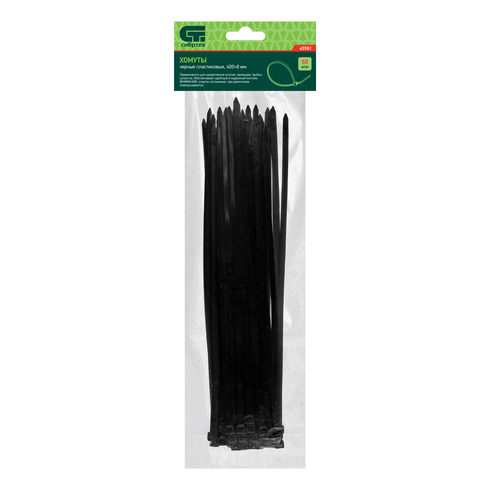 <p>Черные пластиковые хомуты Сибртех 45581, 400 х 8 мм, 50 шт. в упаковке, используются для стяжки кабелей, закрепления трубок, шлангов, рекламных конструкций, а также для упаковки различных предметов. Пригодятся во время прокладки электрических и локальных вычислительных сетей, ремонта компьютерной техники, оформлении торговых стендов, комплектовании товара, будут также полезны дома, на даче и в гараже.</p><h2>Преимущества</h2><ul><li>Надежные соединения — кабельные стяжки изготовлены из прочного нейлона.</li><li>Возможность проведения наружных работ — хомуты устойчивы к ультрафиолету и сохраняют свои свойства при температуре от -35 до +85 ℃.</li><li>50 штук в упаковке — набора хватит надолго.</li></ul>