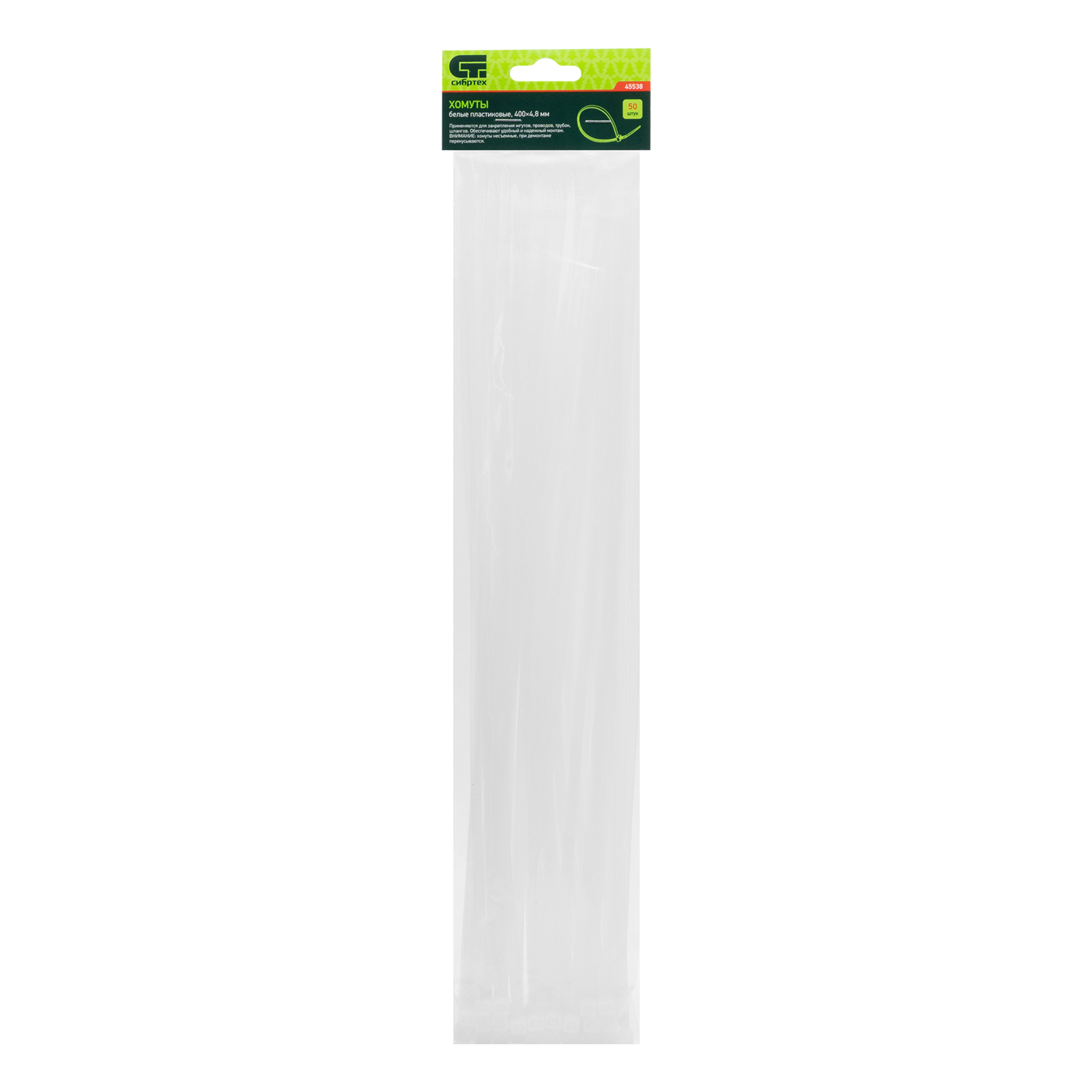 <p>Белые пластиковые хомуты Сибртех 45538, 400 х 4,8 мм, 50 шт. в упаковке, используются для стяжки кабелей, закрепления трубок, шлангов, рекламных конструкций, а также для упаковки различных предметов. Пригодятся во время прокладки электрических и локальных вычислительных сетей, ремонта компьютерной техники, оформлении торговых стендов, комплектовании товара, будут также полезны дома, на даче и в гараже.</p><h2>Преимущества</h2><ul><li>Надежные соединения — кабельные стяжки изготовлены из прочного нейлона.</li><li>Возможность проведения наружных работ — хомуты устойчивы к ультрафиолету и сохраняют свои свойства при температуре от -35 до +85 ℃.</li><li>50 штук в упаковке — набора хватит надолго.</li></ul>