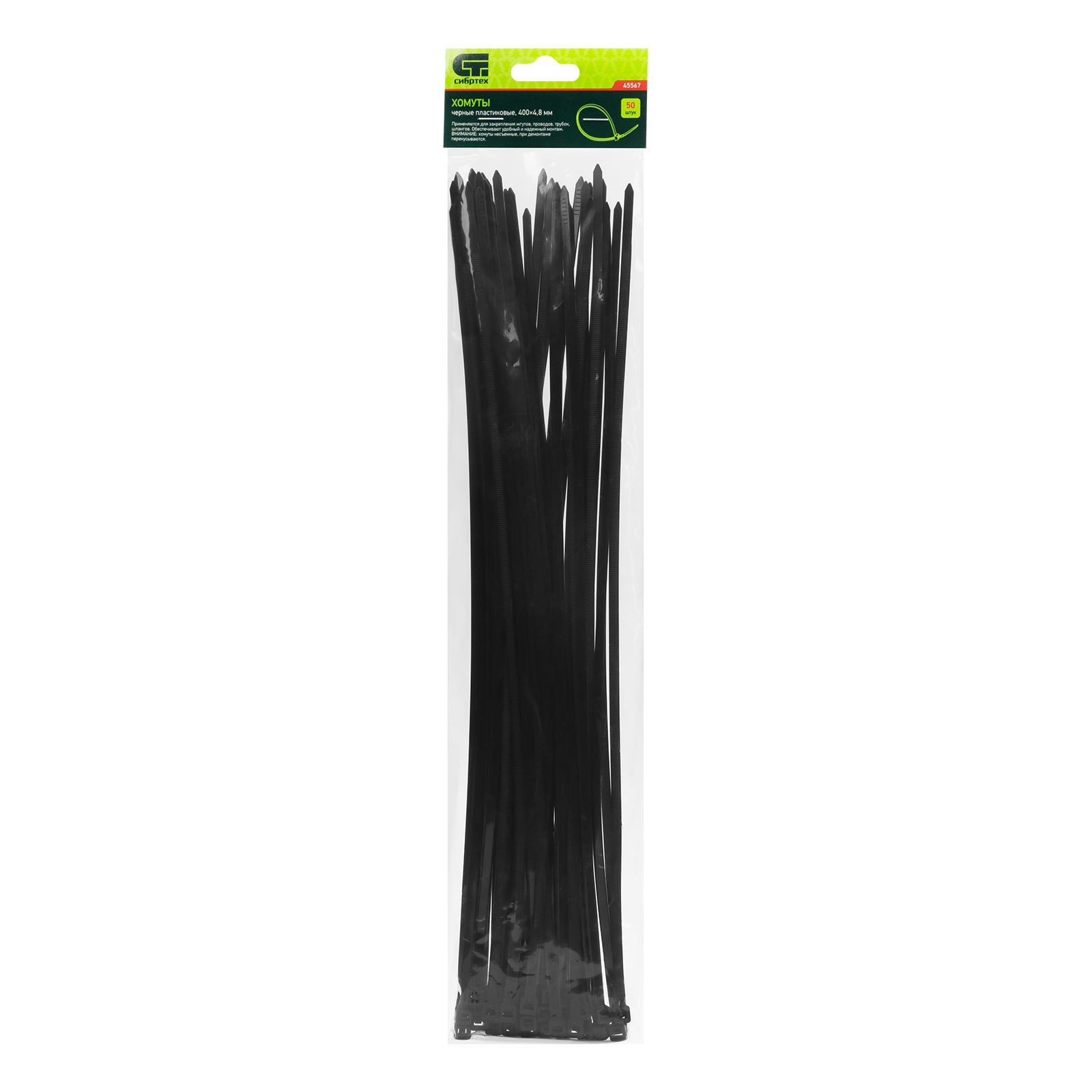 Черные пластиковые хомуты Сибртех 45567, 400 х 4,8 мм, 50 шт. в упаковке, используются для стяжки кабелей, закрепления трубок, шлангов, рекламных конструкций, а также для упаковки различных предметов. Пригодятся во время прокладки электрических и локальных вычислительных сетей, ремонта компьютерной техники, оформлении торговых стендов, комплектовании товара, будут также полезны дома, на даче и в гараже.