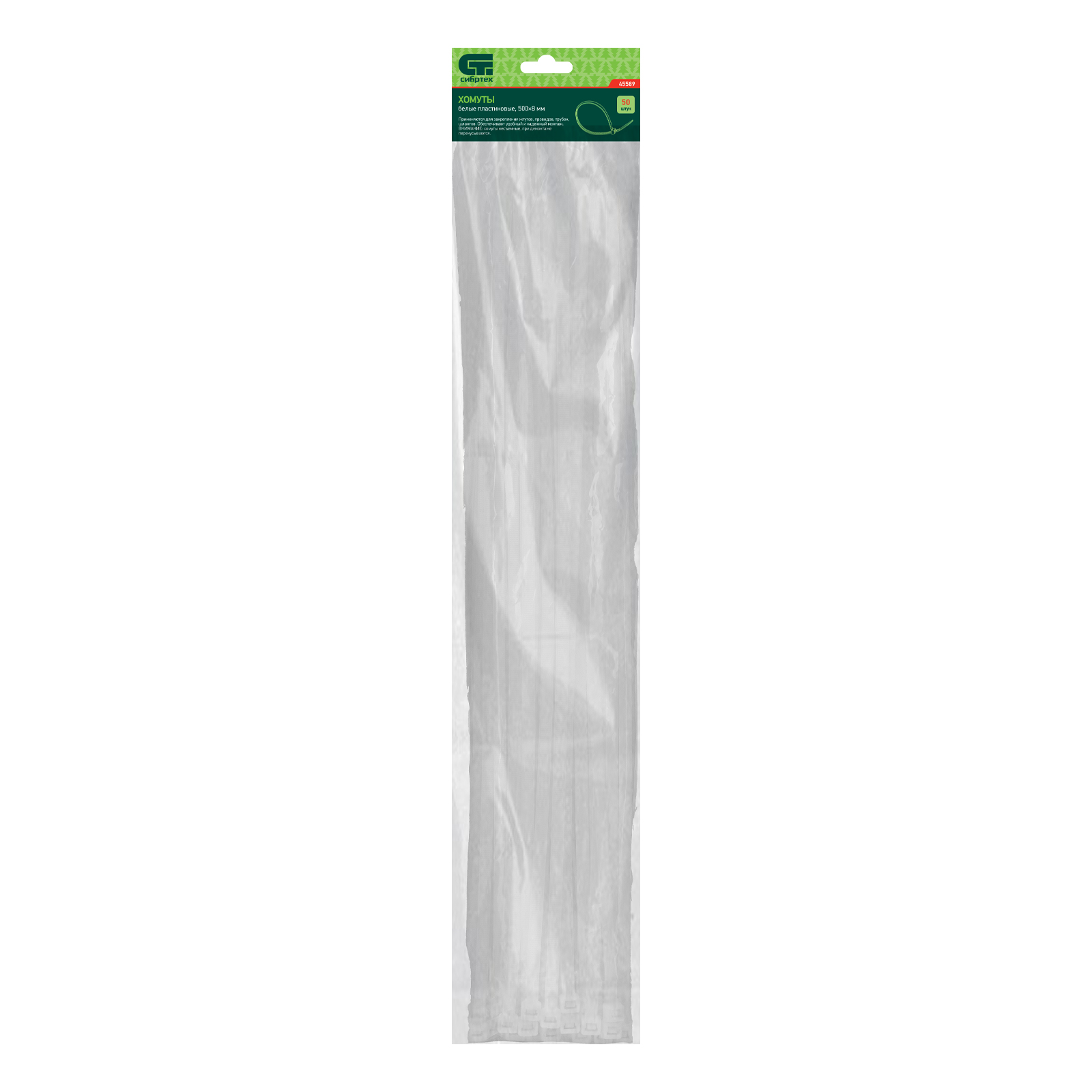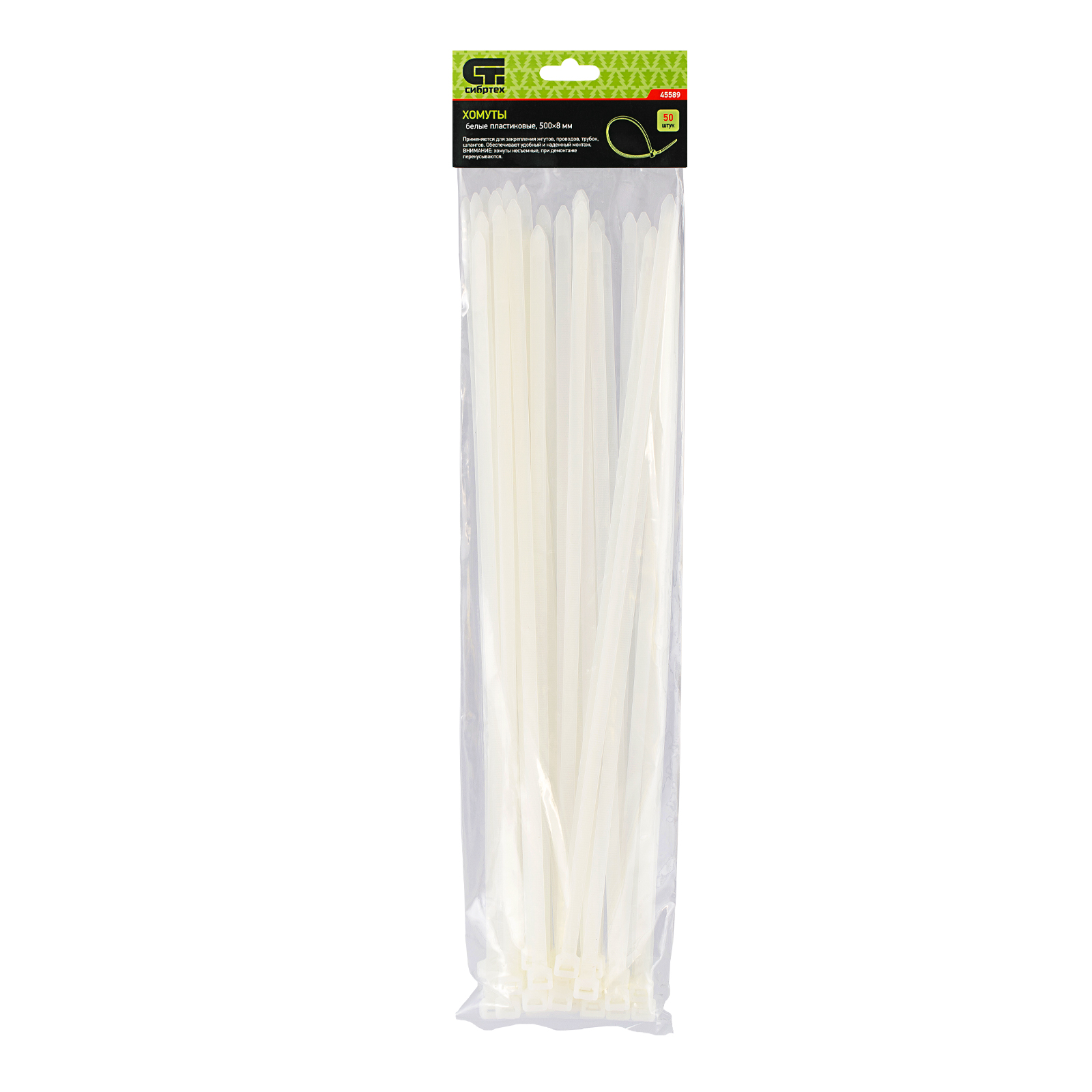 <p>Белые пластиковые хомуты Сибртех 45589, 500 х 8 мм, 50 шт. в упаковке, используются для стяжки кабелей, закрепления трубок, шлангов, рекламных конструкций, а также для упаковки различных предметов. Пригодятся во время прокладки электрических и локальных вычислительных сетей, ремонта компьютерной техники, оформлении торговых стендов, комплектовании товара, будут также полезны дома, на даче и в гараже.</p><h2>Преимущества</h2><ul><li>Надежные соединения — кабельные стяжки изготовлены из прочного нейлона.</li><li>Возможность проведения наружных работ — хомуты устойчивы к ультрафиолету и сохраняют свои свойства при температуре от -35 до +85 ℃.</li><li>50 штук в упаковке — набора хватит надолго.</li></ul>