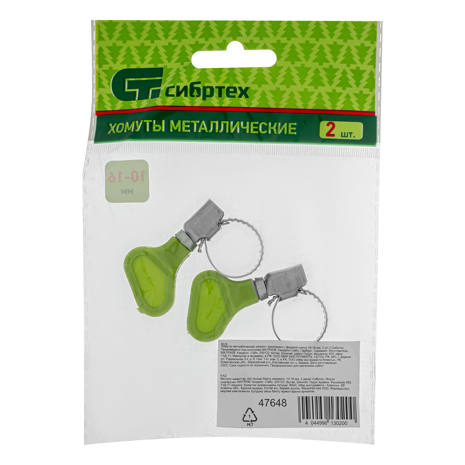 Металлические хомуты Сибртех 47648 с элементом крепления в форме ключа, с диаметром охвата 10-16 мм, 2 шт. в упаковке, используются для соединения труб и шлангов. Подходят для многократного применения. Стяжки-хомуты затягиваются посредством винта-барашка, поэтому для их установки не требуются дополнительные инструменты.