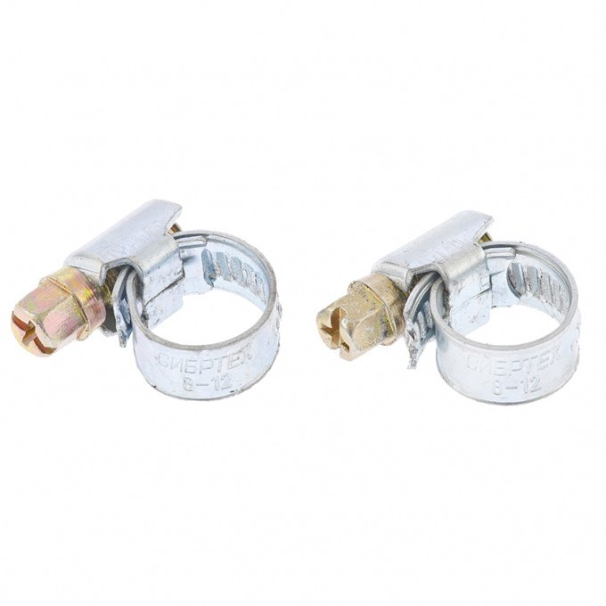 Металлические хомуты Сибртех 47654 со стандартным болтовым креплением, диаметром охвата 8-12 мм и шириной 9 мм, 2 шт. в упаковке, — крепежные элементы для соединения труб и шлангов. Обеспечивают плавную регулировку диаметра обжима, подходят для многократного использования. Строительные стяжки применяют для монтажа водопроводных, отопительных, вентиляционных систем.