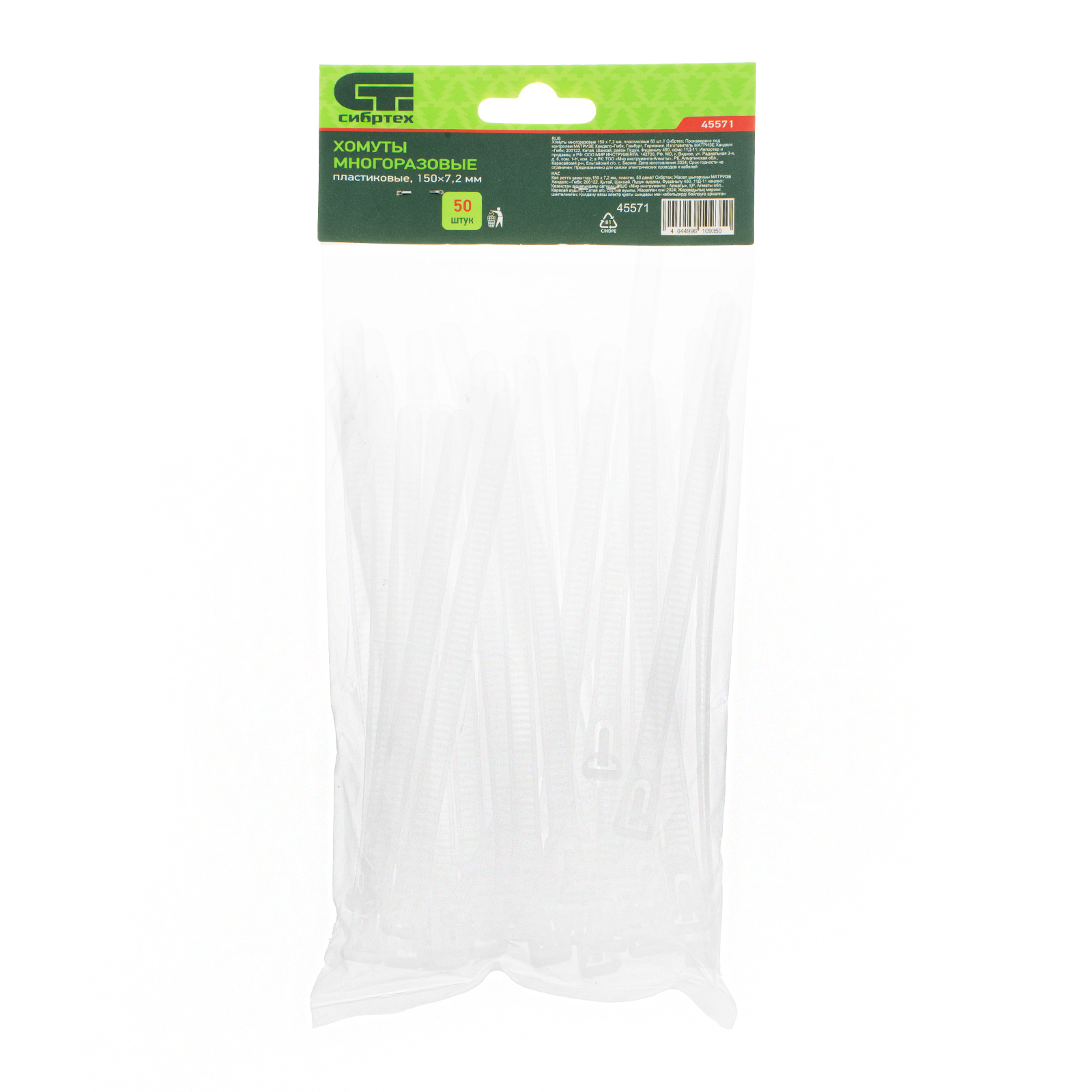<p>Пластиковые многоразовые хомуты Сибртех 45571 размером 150 х 7,2 мм, 50 шт. в упаковке, — приспособления для стяжки кабелей, шлангов или трубок. Могут применяться для подвязки растений или упаковки предметов. Белые пластиковые стяжки пригодятся во время выполнения электромонтажных работ, ремонта техники, будут полезны в промышленности, торговле, а также в быту.</p><h2>Преимущества</h2><ul><li>Надежные соединения — кабельные стяжки изготовлены из прочного нейлона.</li><li>Возможность проведения наружных работ — хомуты устойчивы к ультрафиолету и сохраняют свои свойства при температуре от -35 до +85 ℃.</li><li>Многократное использование — кабельные стяжки имеют раскрывающиеся замки.</li><li>50 штук в упаковке — набора хватит надолго.</li></ul>