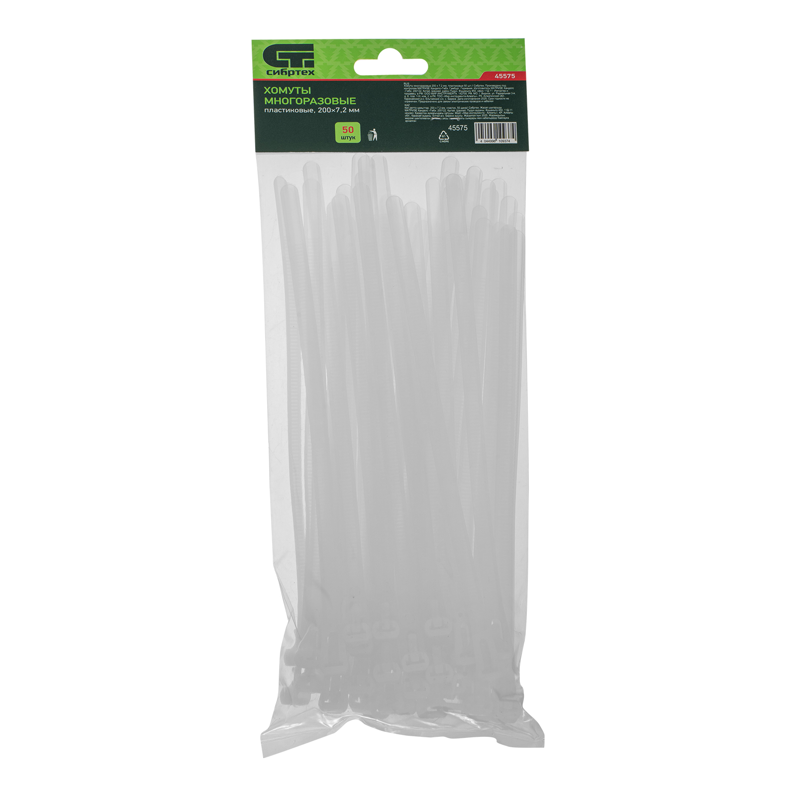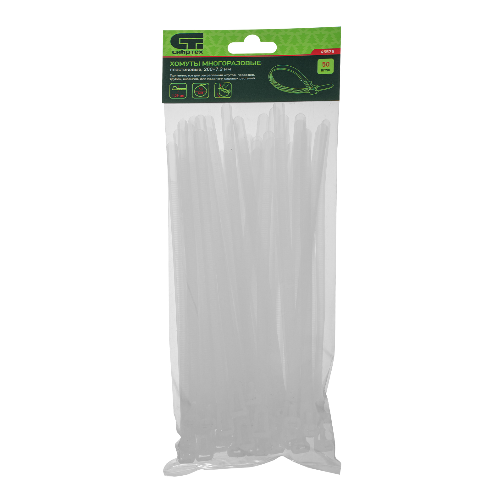 <p>Пластиковые многоразовые хомуты Сибртех 45575 размером 200 х 7,2 мм, 50 шт. в упаковке, — приспособления для стяжки кабелей, шлангов или трубок. Могут применяться для подвязки растений или упаковки предметов. Белые пластиковые стяжки пригодятся во время выполнения электромонтажных работ, ремонта техники, будут полезны в промышленности, торговле, а также в быту.</p><h2>Преимущества</h2><ul><li>Надежные соединения — кабельные стяжки изготовлены из прочного нейлона.</li><li>Возможность проведения наружных работ — хомуты устойчивы к ультрафиолету и сохраняют свои свойства при температуре от -35 до +85 ℃.</li><li>Многократное использование — кабельные стяжки имеют раскрывающиеся замки.</li><li>50 штук в упаковке — набора хватит надолго.</li></ul>