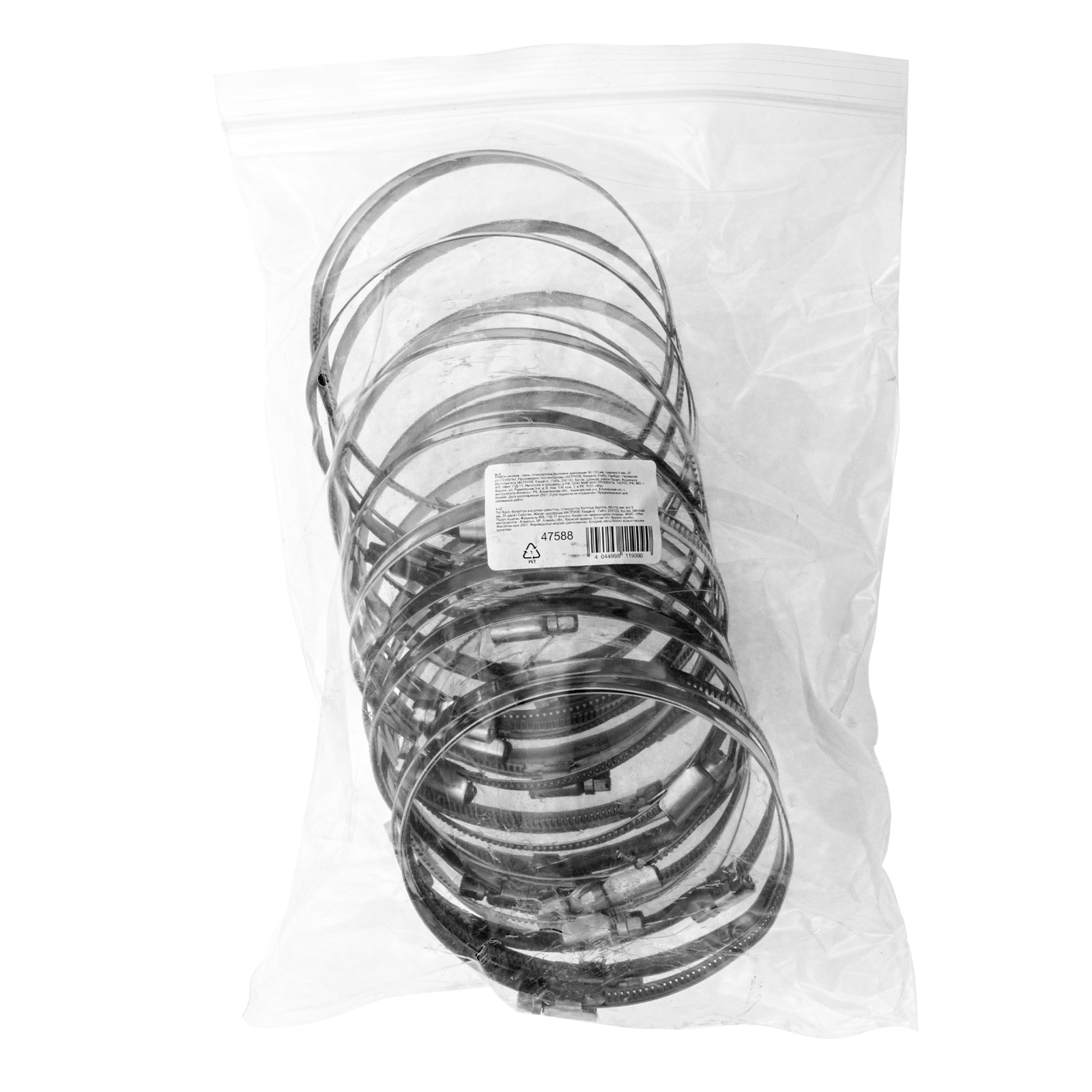 Хомуты Сибртех 47588 из нержавеющей стали, со стандартным болтовым креплением, с диаметом охвата 90-110 мм, шириной 9 мм, 25 шт. в упаковке, — крепежные элементы, применяющиеся для соединения шлангов и труб. Подходят для многократного использования. Хомуты затягиваются винтами, что обеспечивает удобство и надежность фиксации. Могут быть использованы для монтажа трубопроводных систем и обеспечения герметичных соединений в различных инженерных и транспортных системах.