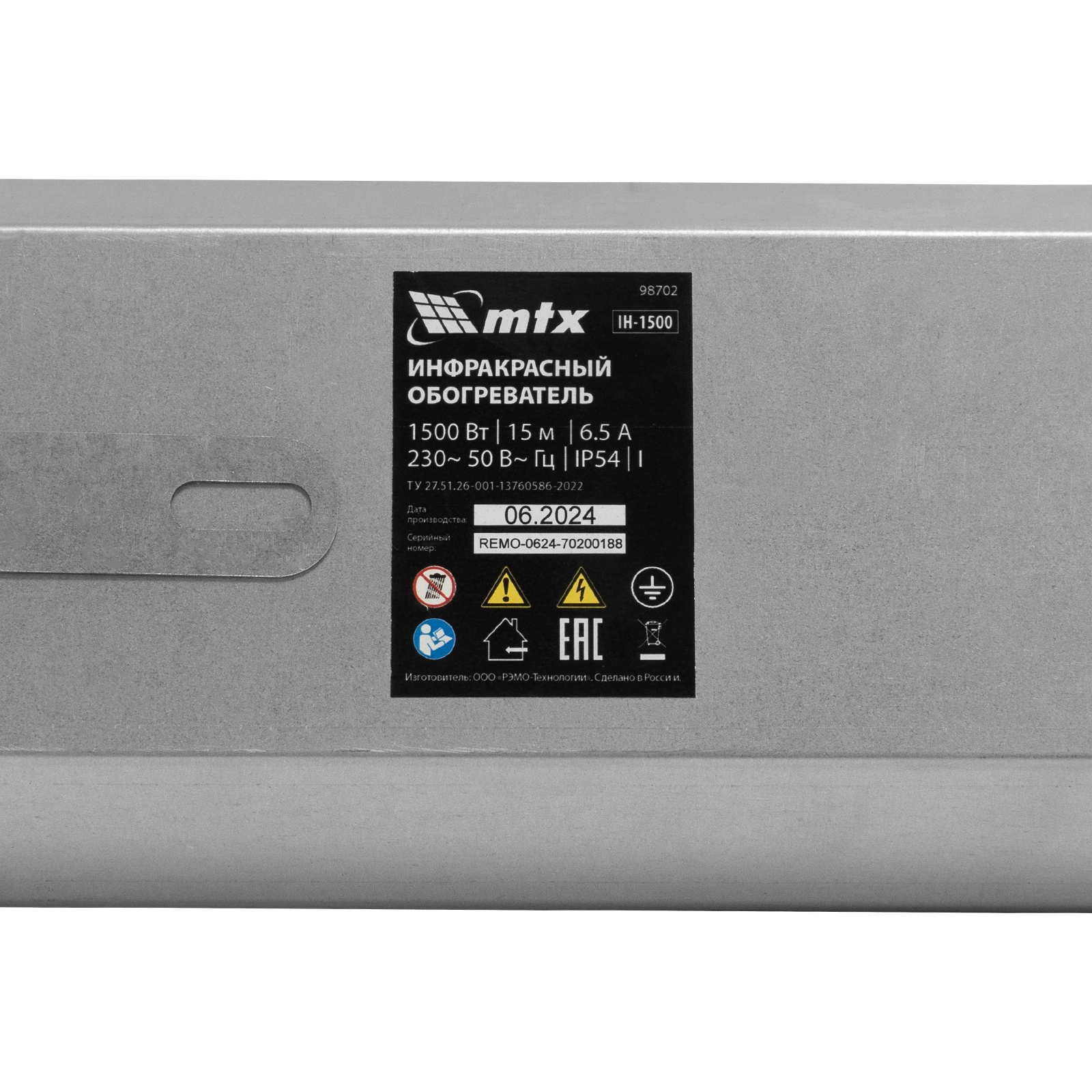 Инфракрасный обогреватель MTX IH-1500 98702 подключается к сети 230 В, потребляет мощность до 1500 Вт, защищен по стандарту IP54 и оснащен кабелем длиной 1,8 м с вилкой. Предназначен для обогрева помещений, благодаря высокой степени защиты IP54 не боится влаги, поэтому может быть установлен на улице под открытым небом, на открытых верандах, в беседках, курятниках, теплицах и подвальных помещениях, часто используется для сушки деревянных поверхностей. Служит основным источником тепла на площади до 15 м² и дополнительным — в помещениях до 30 м². Произведен в России.
