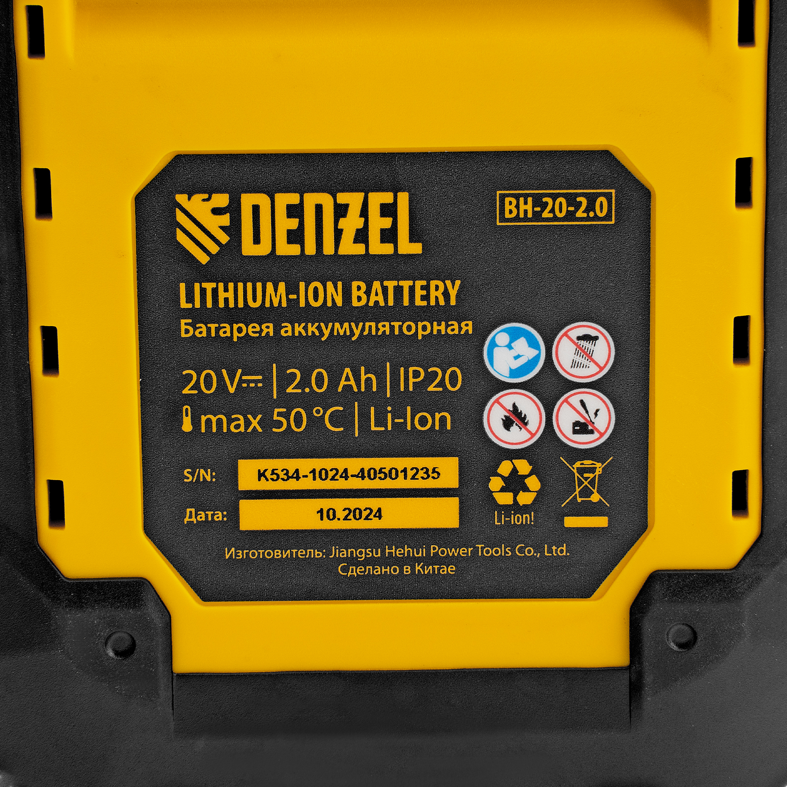 - Универсальность — аккумулятор Li-Ion емкостью 2 А·ч совместим со всеми инструментами единой платформы Denzel Power System 20V.