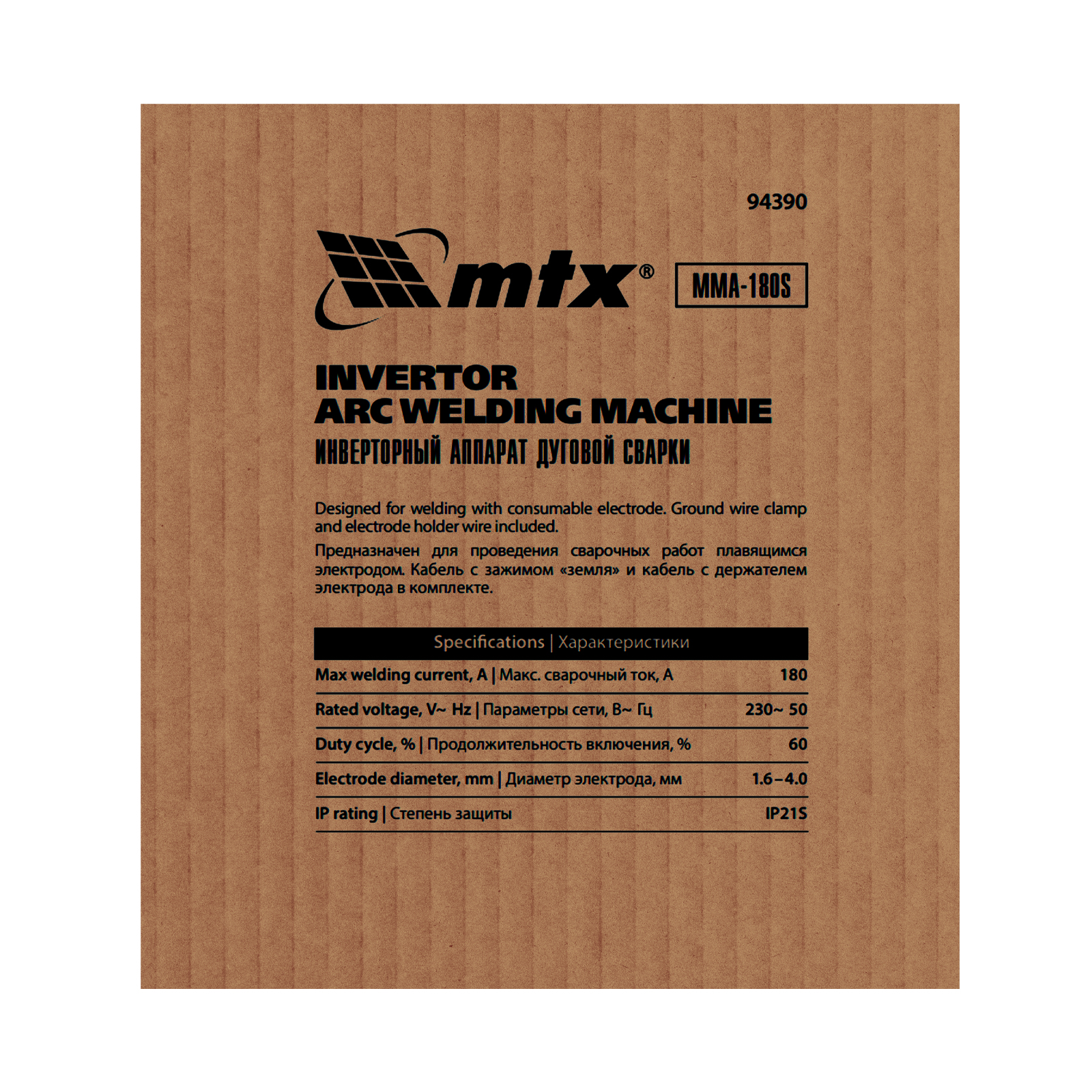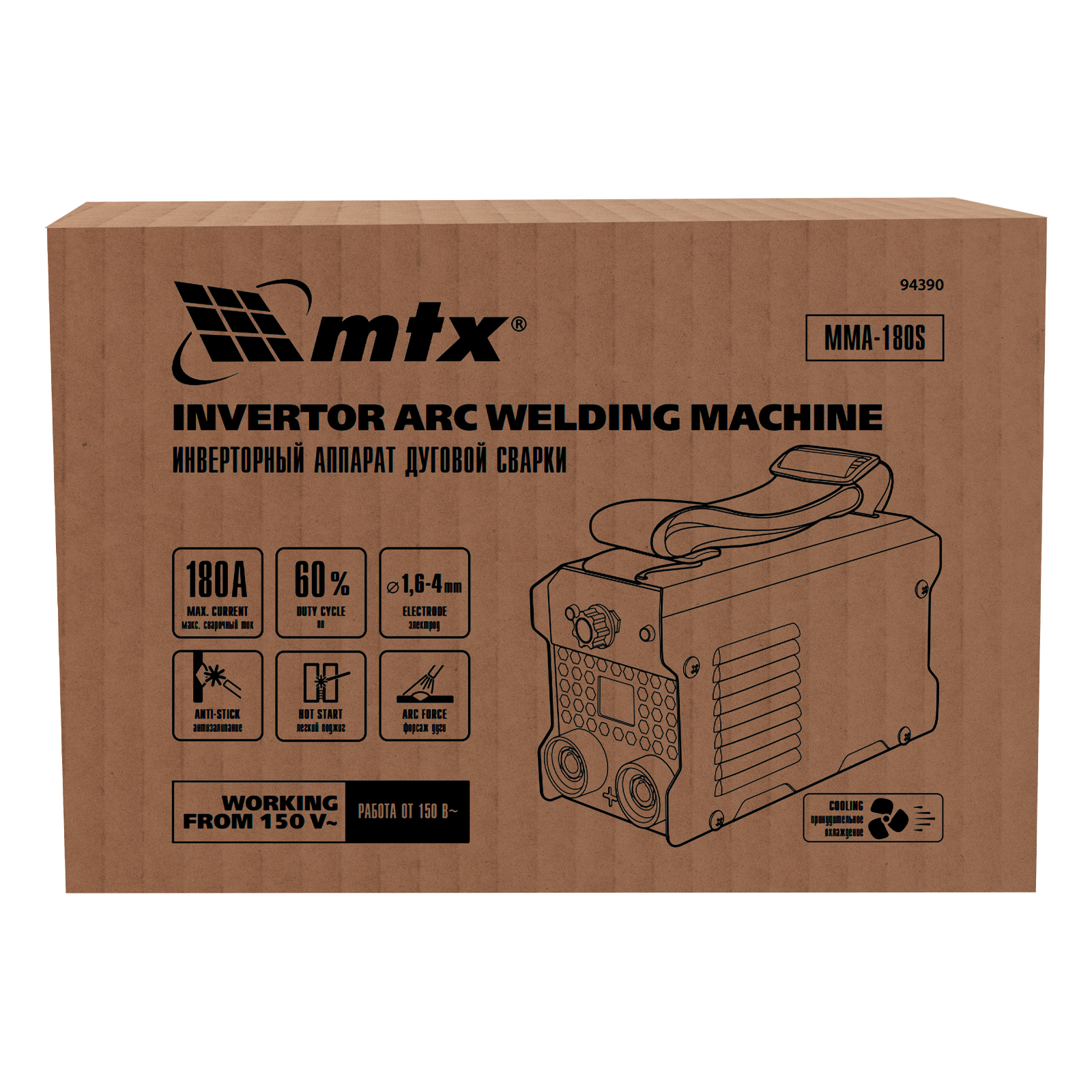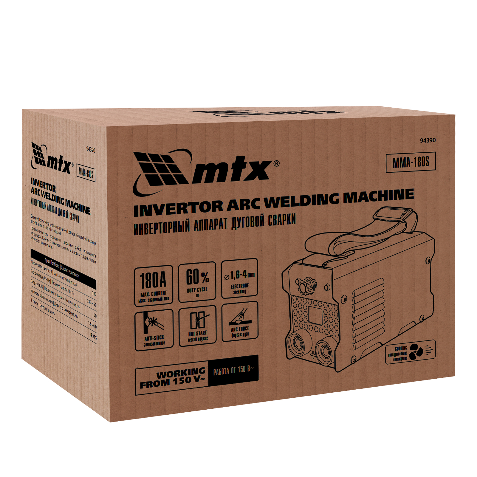 Инверторный аппарат MTX MMA-180S 94390 предназначен для дуговой сварки изделий из низкоуглеродистой стали с помощью штучных электродов диаметром 1,6-4 мм. Сварочный ток плавно регулируется в диапазоне 20-180 А, продолжительность включения (ПВ) на максимальном токе составляет 60%. Аппарат позволяет эффективно выполнять поставленные задачи даже при нестабильном напряжении. Оптимально подходит для использования в частных хозяйствах, будет полезен сотрудникам ЖКХ и работникам аварийно-ремонтных бригад. Отличается низким уровнем шума.