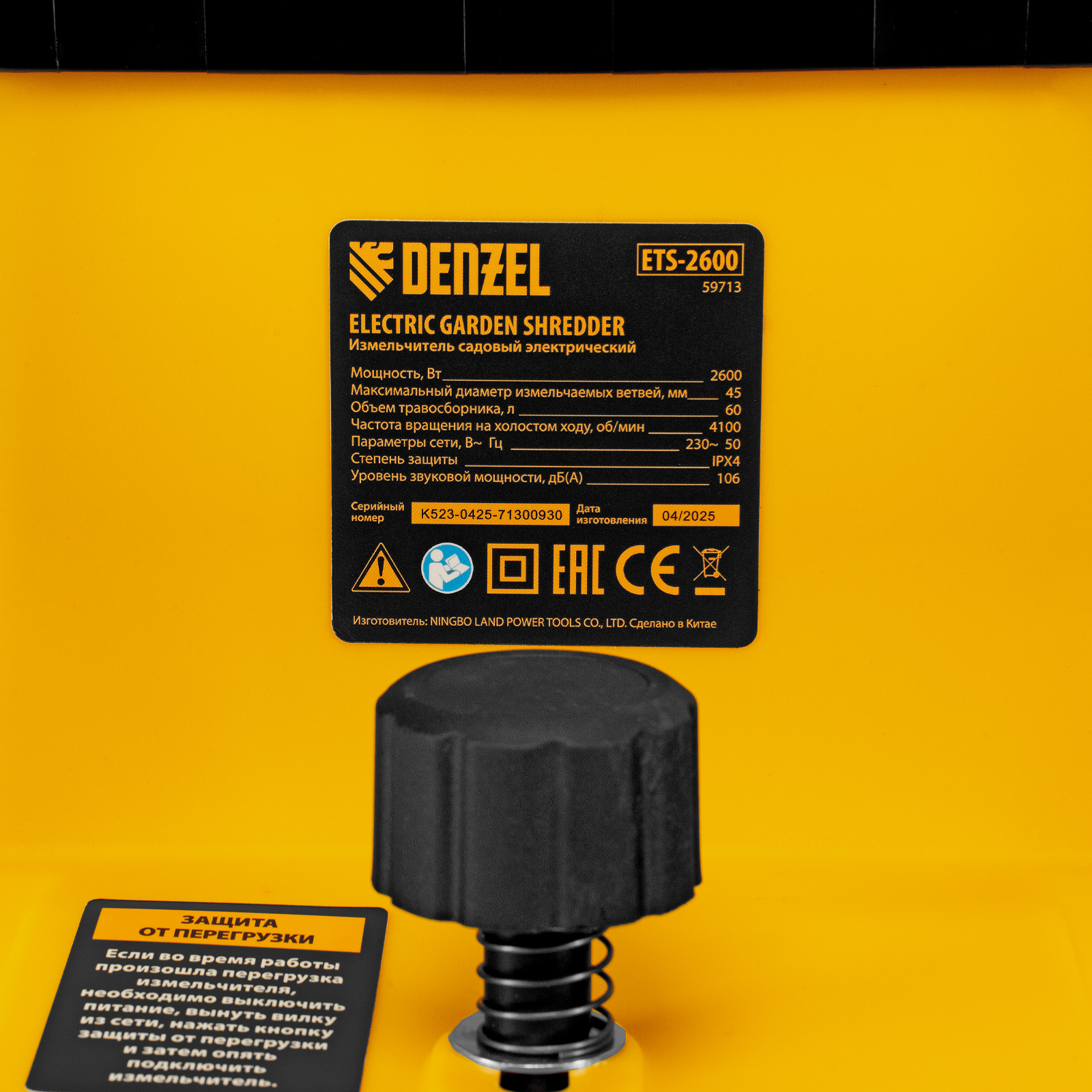 Садовый электрический измельчитель Denzel ETS-2600 59713 мощностью 2600 Вт предназначен для переработки веток диаметром до 45 мм. Полученную щепу можно использовать в качестве мульчи или сырья для компоста. Измельченные ветки попадают в мягкую подвесную сумку-травосборник объемом 60 л, которую не нужно часто опустошать. Мощный двигатель обеспечивает частоту вращения на холостом ходу 4500 об/мин, что позволяет быстро и эффективно справляться с работой. Измельчитель будет полезен на дачном участке.
