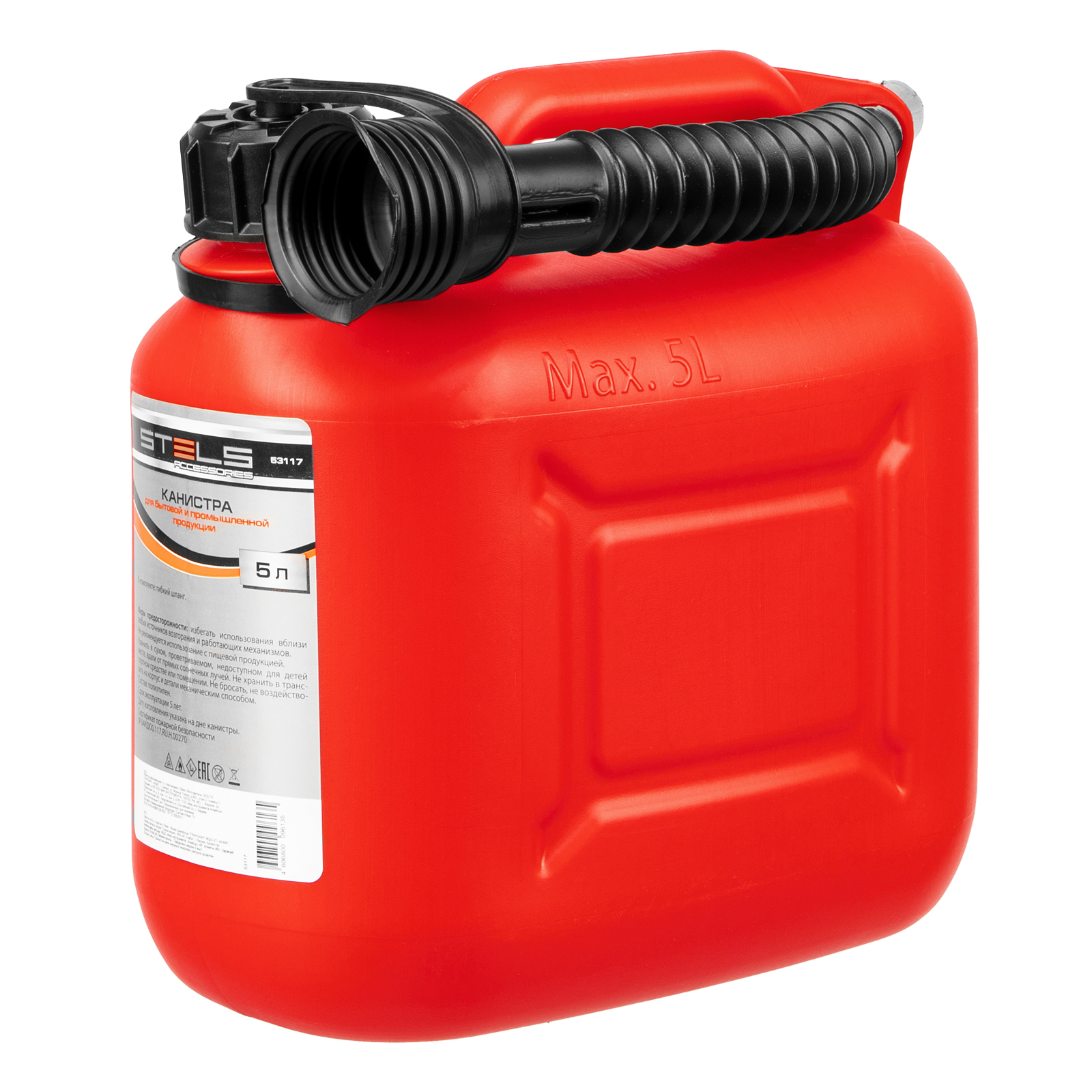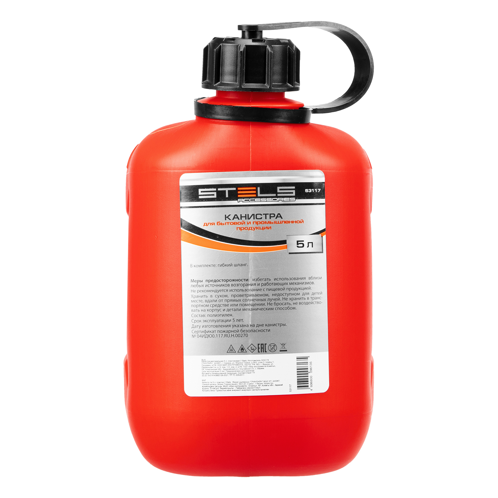 Пластиковая канистра Stels 53117 объемом 5 литров, вертикальная, предназначена для хранения и транспортировки жидкостей, что делает ее незаменимой в различных отраслях промышленности и быта.