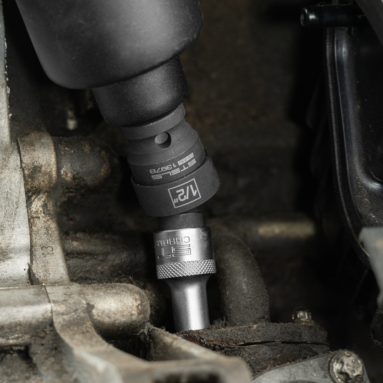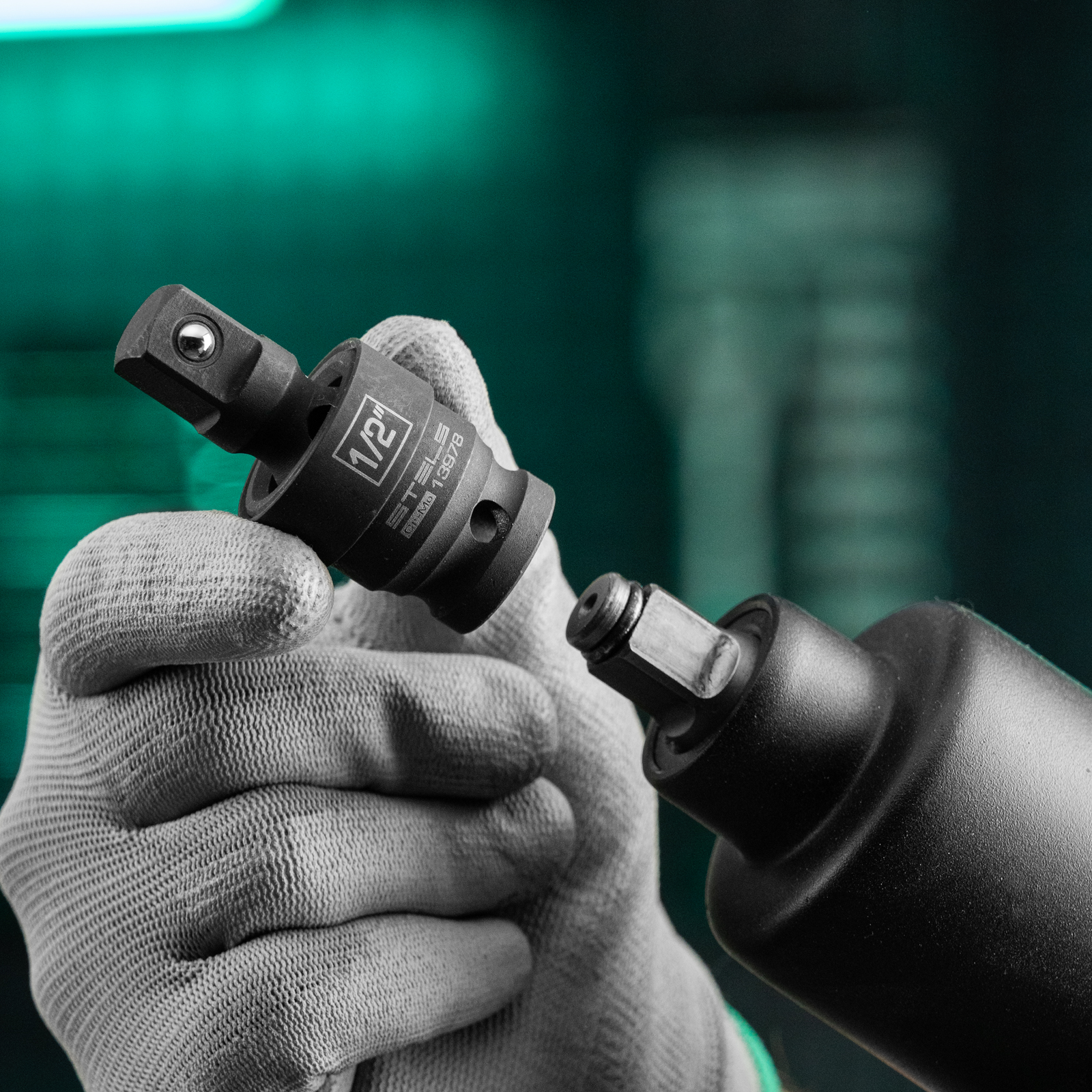 Кардан ударный Stels 13978 устанавливается на гайковерты с посадочным размером 1/2 дюйма для удержания торцевых головок. За счет шарнирной конструкции он позволяет проводить работы в труднодоступных местах и под углом. Пригодится в автомастерской, на строительной площадке в ходе проведения слесарных и монтажных/демонтажных работ.