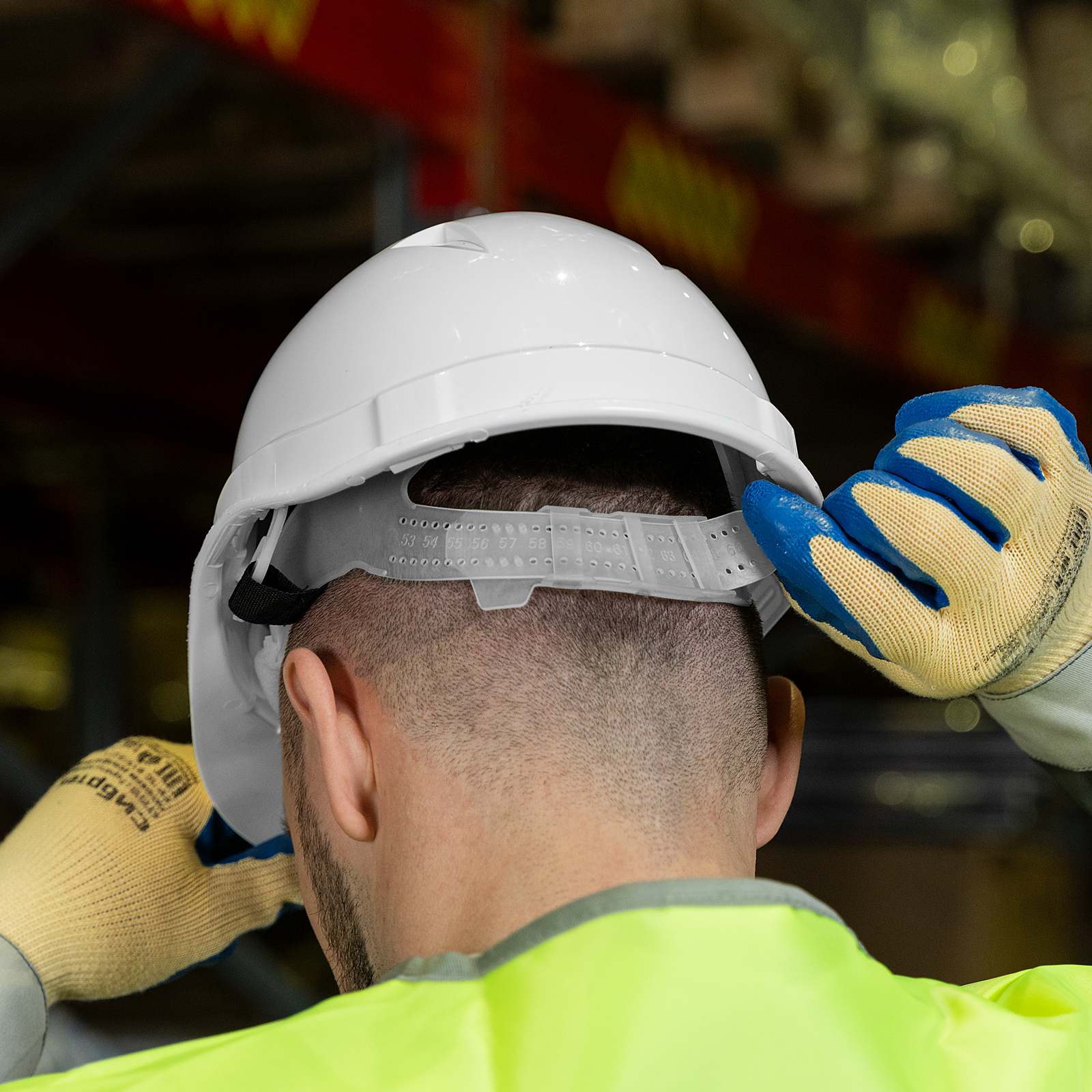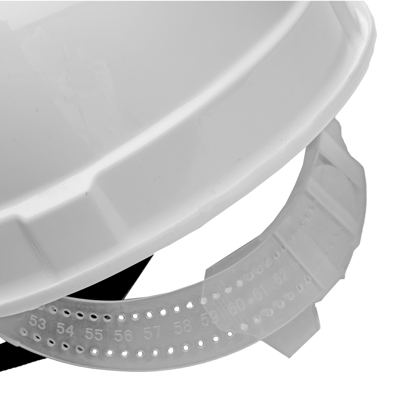 - Регулируемое оголовье — каску можно подогнать под размер головы (с 52 по 62) для надежной фиксации.