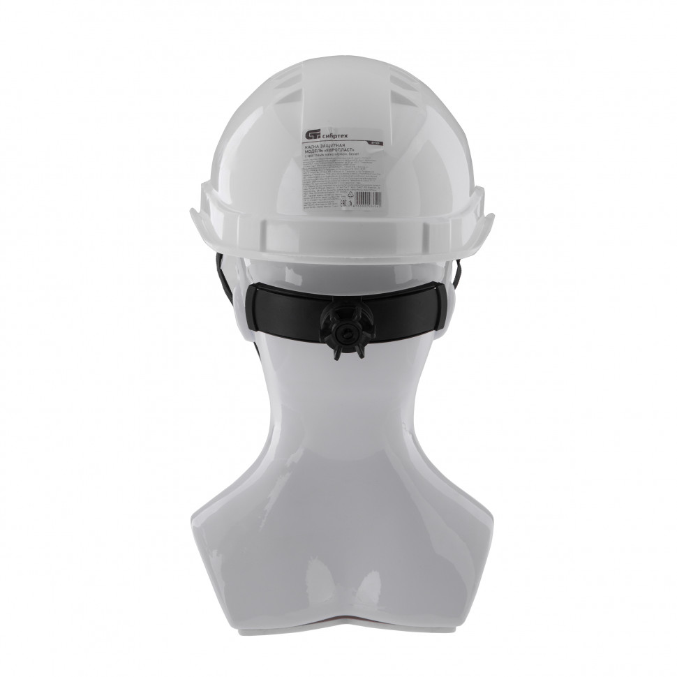 Белая каска с храповым механизмом Сибртех 89109, модель Европласт (К-03), предназначена для защиты головы от механических повреждений и влаги. Каска необходима на производстве, стройке и в других местах, где требуется обеспечить безопасность работника. Наголовное крепление с храповым механизмом позволяет плавно и точно регулировать размер оголовья с 52 по 62, надежно фиксируя каску на голове.