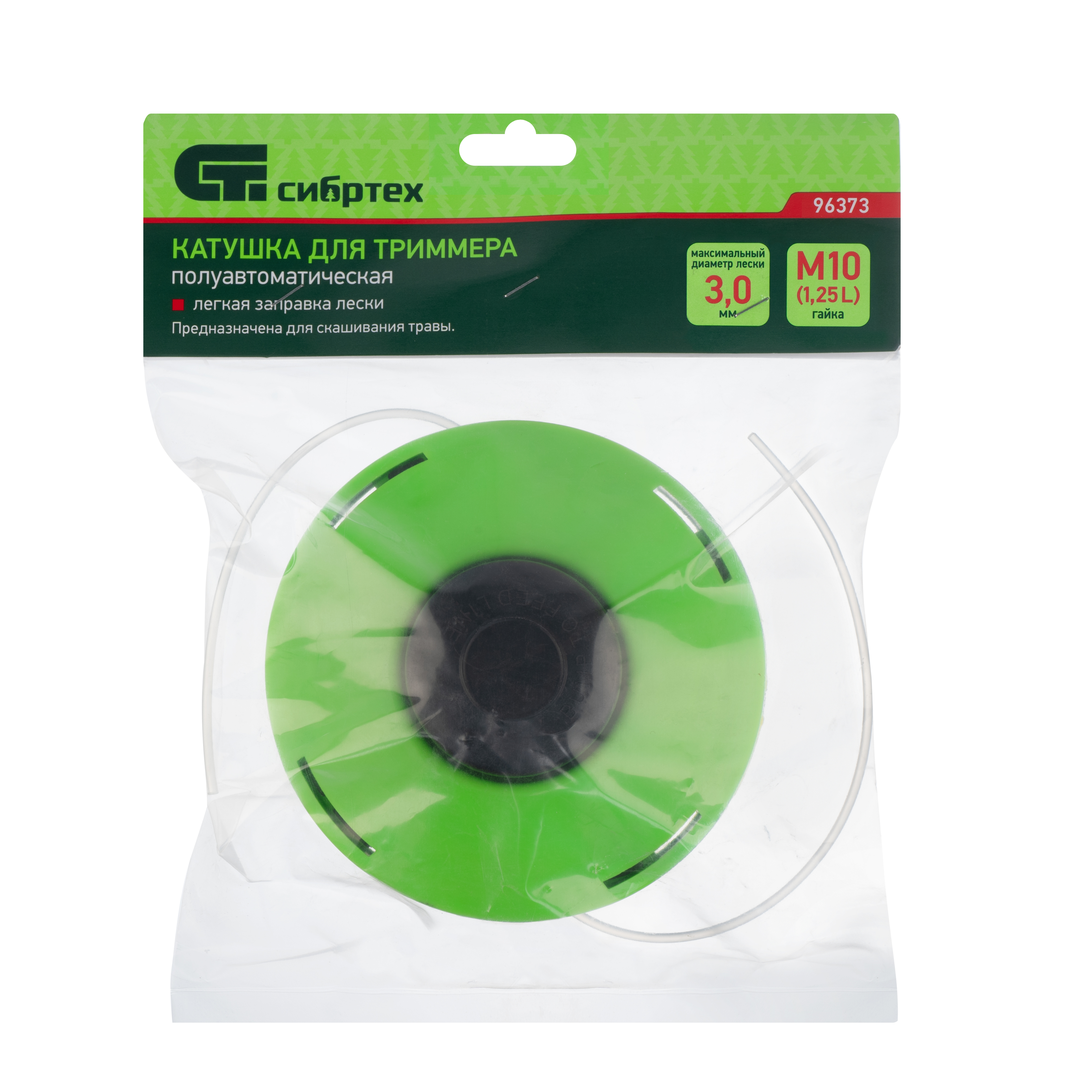 Полуавтоматическая катушка Сибртех 96373 с легкой заправкой лески крепится на вал бензинового или электрического триммера при помощи гайки М10 х 1,25 мм с левой резьбой. Заправляется леской диаметром до 3 мм, что позволяет использовать ее для подравнивания газона и скашивания сорняков. Катушка пригодится владельцам загородных участков.