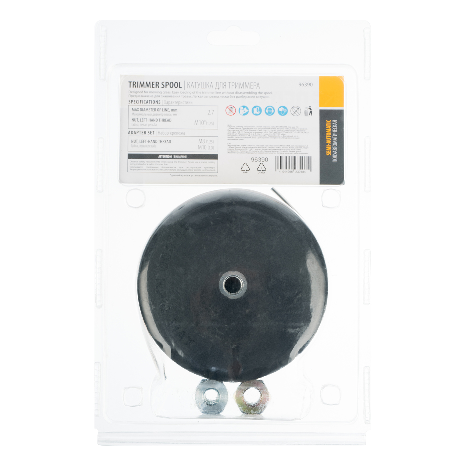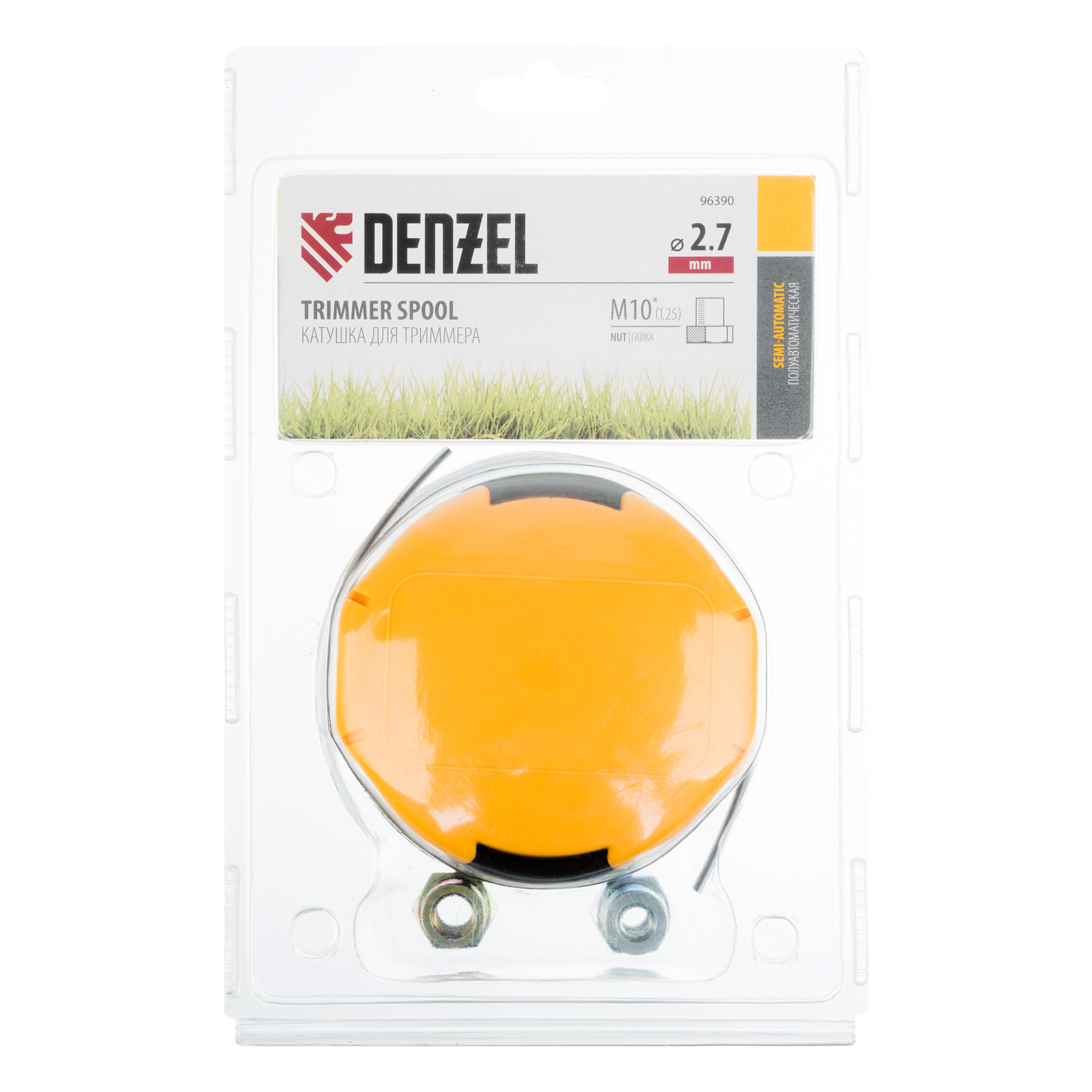 Полуавтоматическая триммерная катушка Denzel 96390 с легкой заправкой лески крепится на вал триммера при помощи гайки М10 с левой резьбой и шагом 1,25 мм, дополнительно комплектуется гайками М10 х 1 мм (правая резьба) и М8 х 1,25 мм (левая резьба). Заправляется леской диаметром до 2,7 мм, устанавливается на вал бензинового или электрического триммера. Используется для скашивания молодой газонной травы и удаления сорняков.