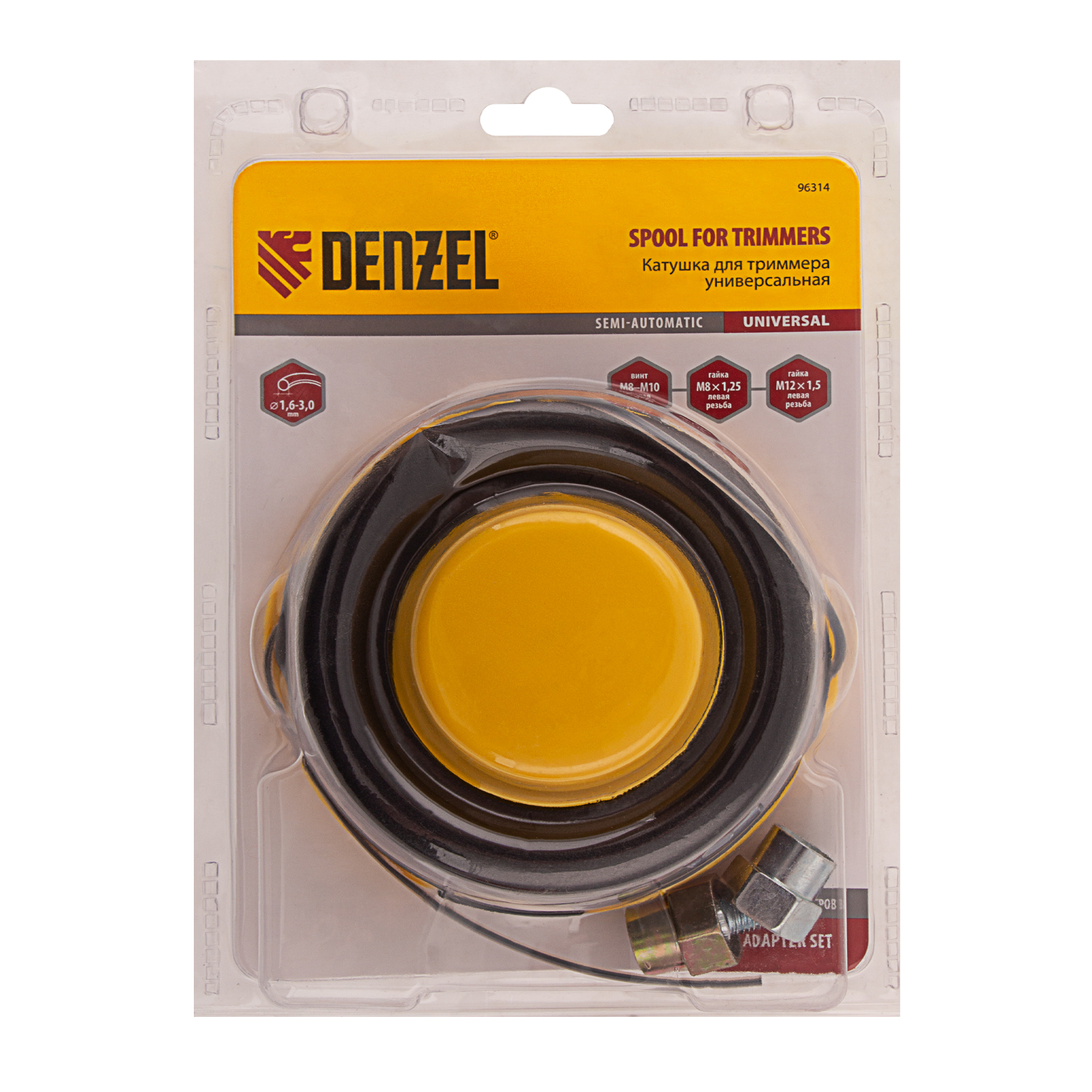 Универсальная триммерная катушка Denzel 96314 с адаптерами (гайка M8 x 1,25, левая резьба, гайка M12 x 1,25, левая резьба, адаптер «папа»-«папа» M8-M10, левая резьба) подходит практически для любой электро- и бензокосы с присоединительным винтом или гайкой. Леска диаметром до 3 мм позволяет скосить газонную траву, многолетние сорняки и в несколько этапов справиться с бурьяном.