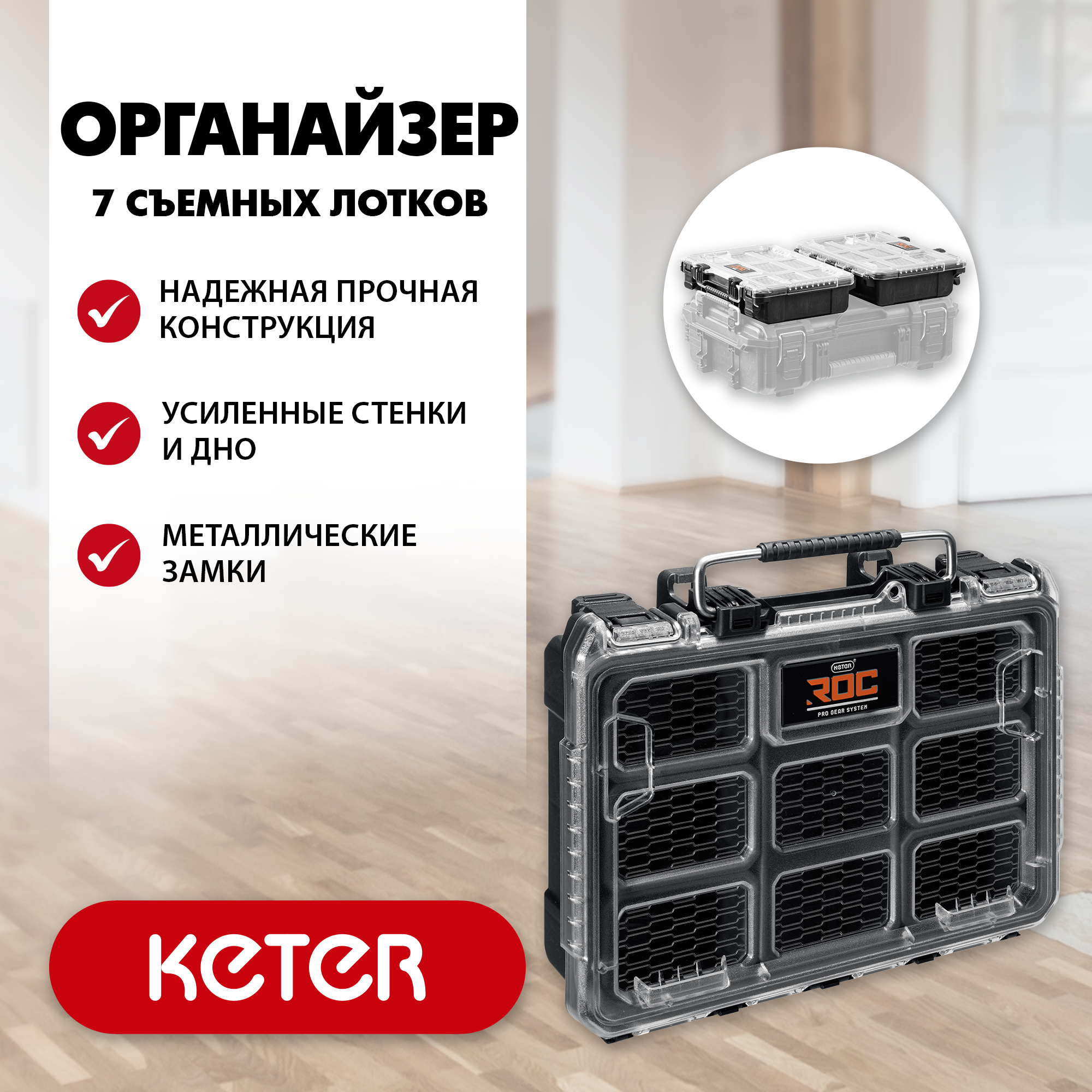 Вместительный органайзер 14” является частью системы KETER PRO GEAR, позволяющей соединять нужные вам ящики в любой комбинации, для хранения или удобства переноски.