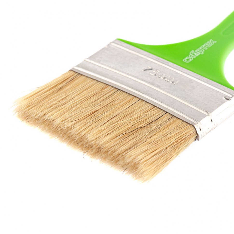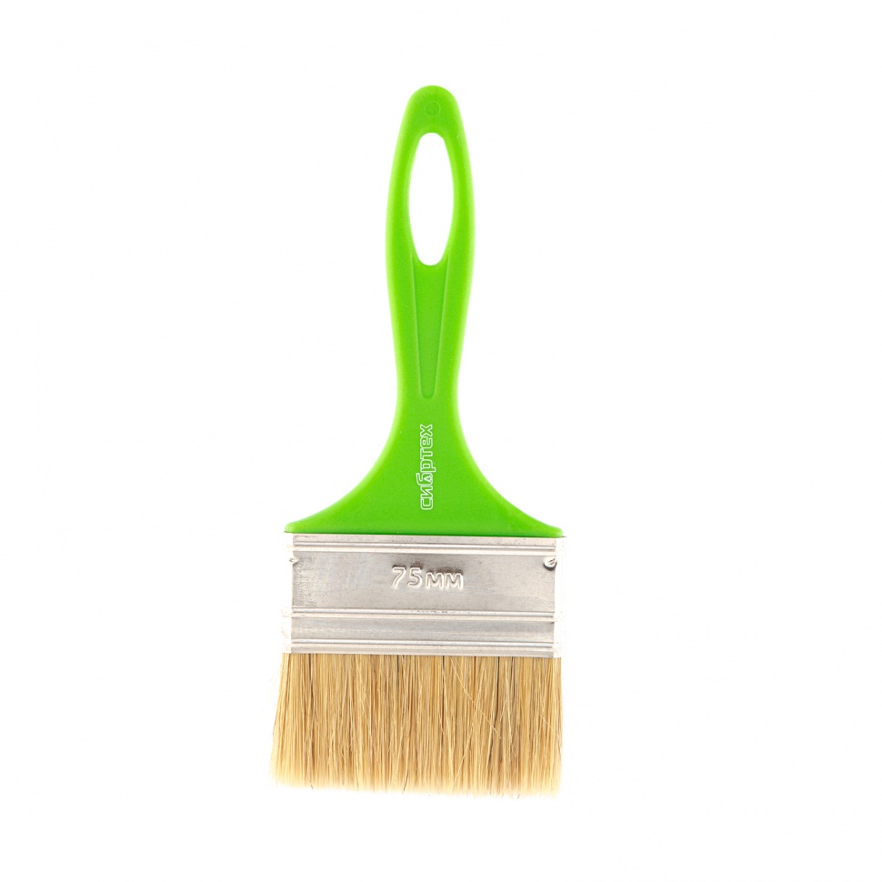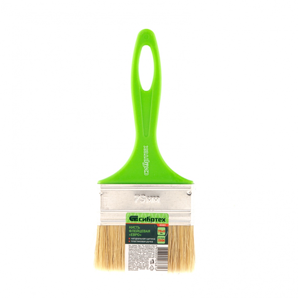 Флейцевая кисть Сибртех «Евро» 83303 шириной 75 мм и толщиной 8 мм, с натуральной щетиной и пластиковой ручкой, предназначена для первичного окрашивания либо создания финишного слоя на небольших или узких участках поверхности. Кисть обладает хорошими краскообменными качествами и подходит для любых видов лакокрасочных материалов (ЛКМ).