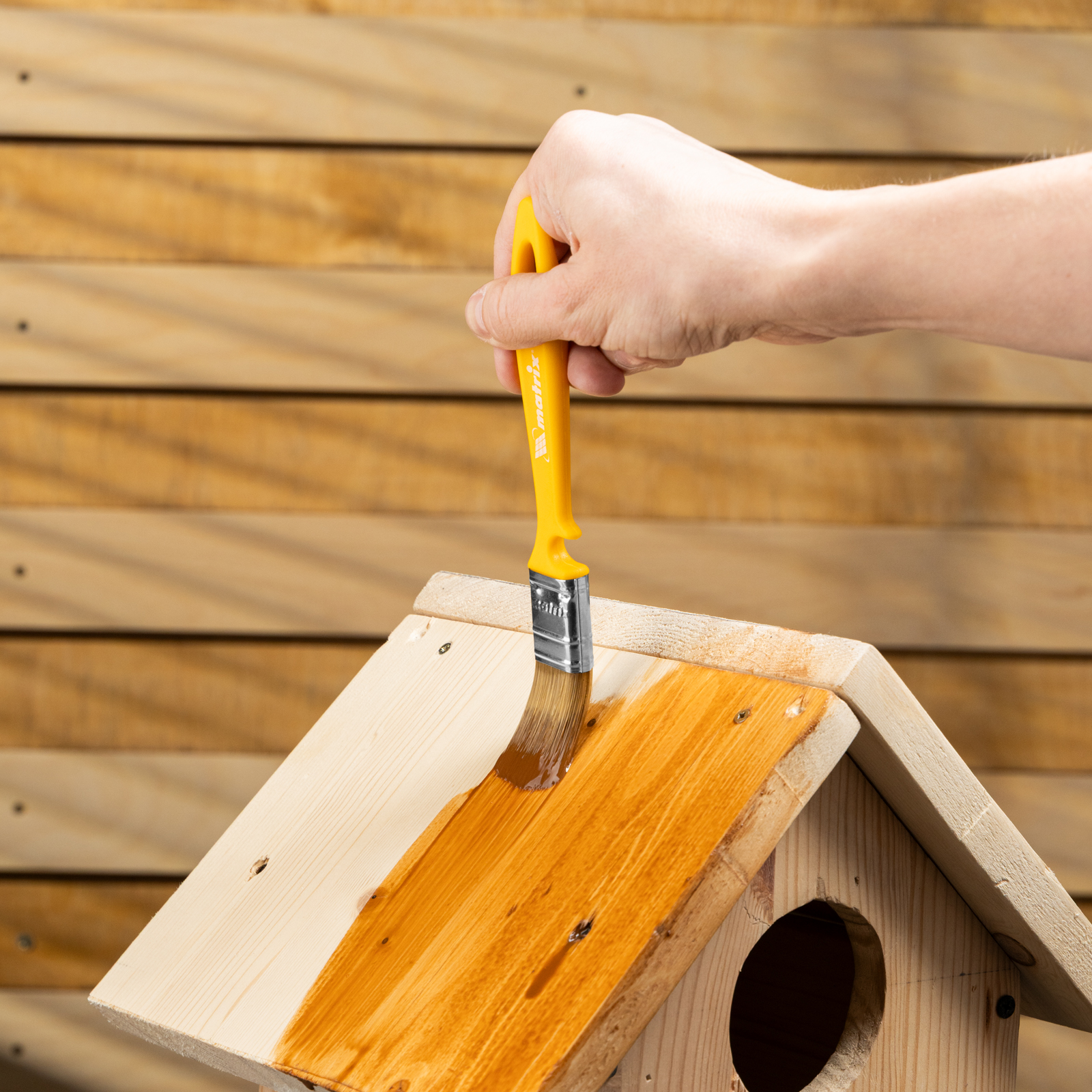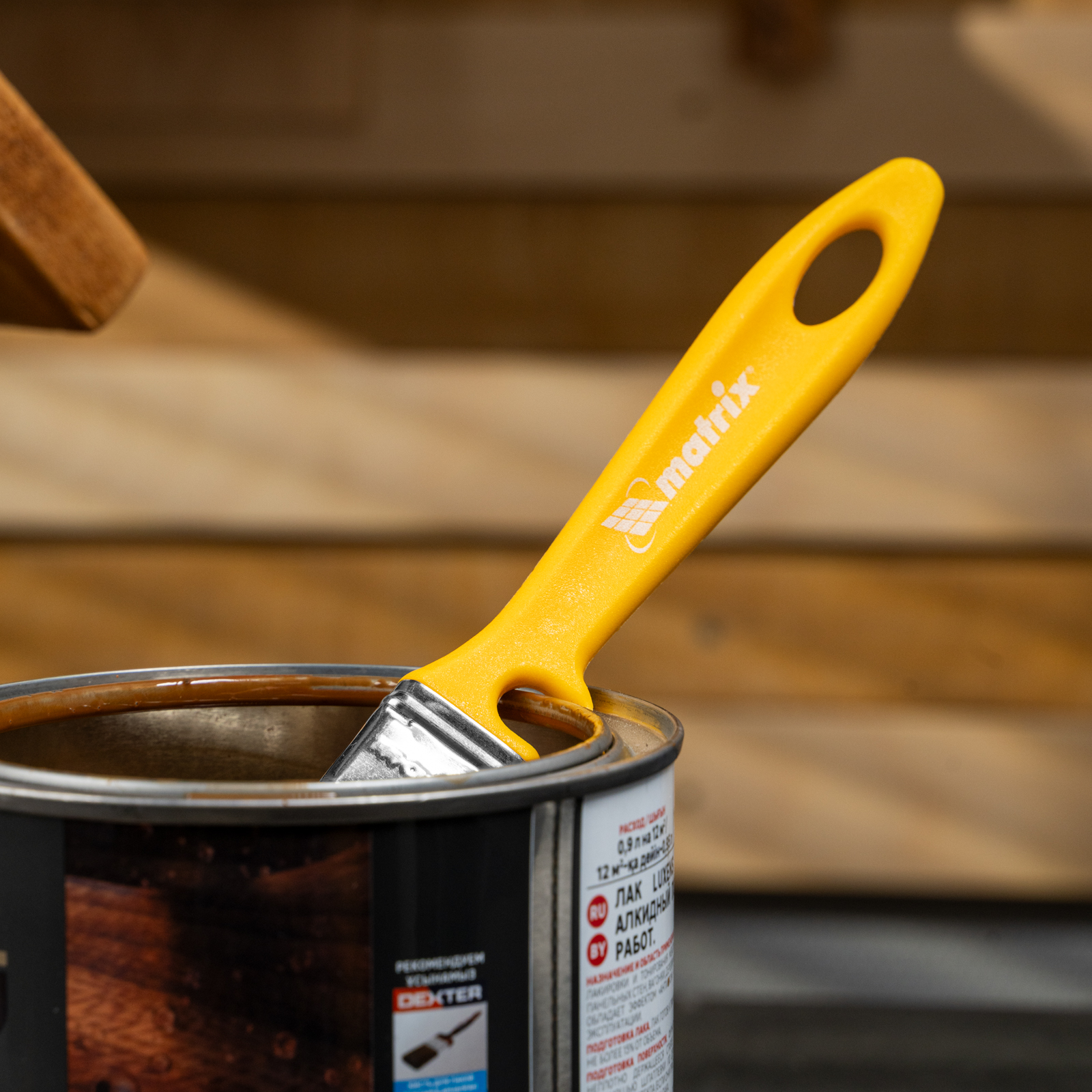 - Продуманное хранение — в рукоятке имеется отверстие для подвешивания кисти, а на время перерыва в работе инструмент можно закрепить на краю ведра или банки — для этого предусмотрена специальная выемка.