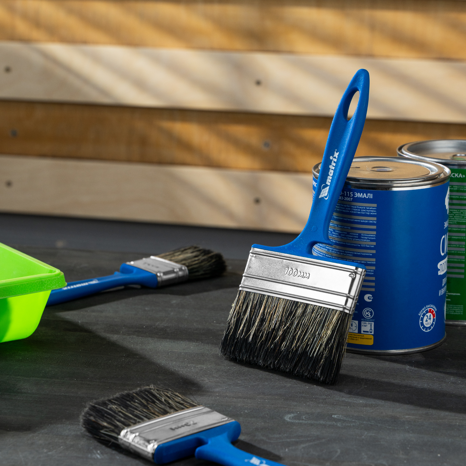 - Удобное хранение — специальная форма рукоятки позволяет закрепить инструмент на краю банки или ведра, а отверстие в верхней части служит для подвешивания кисти.