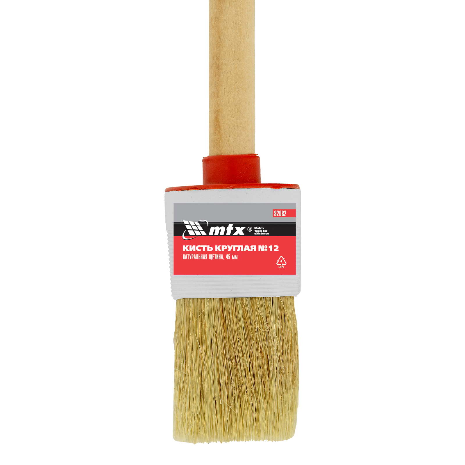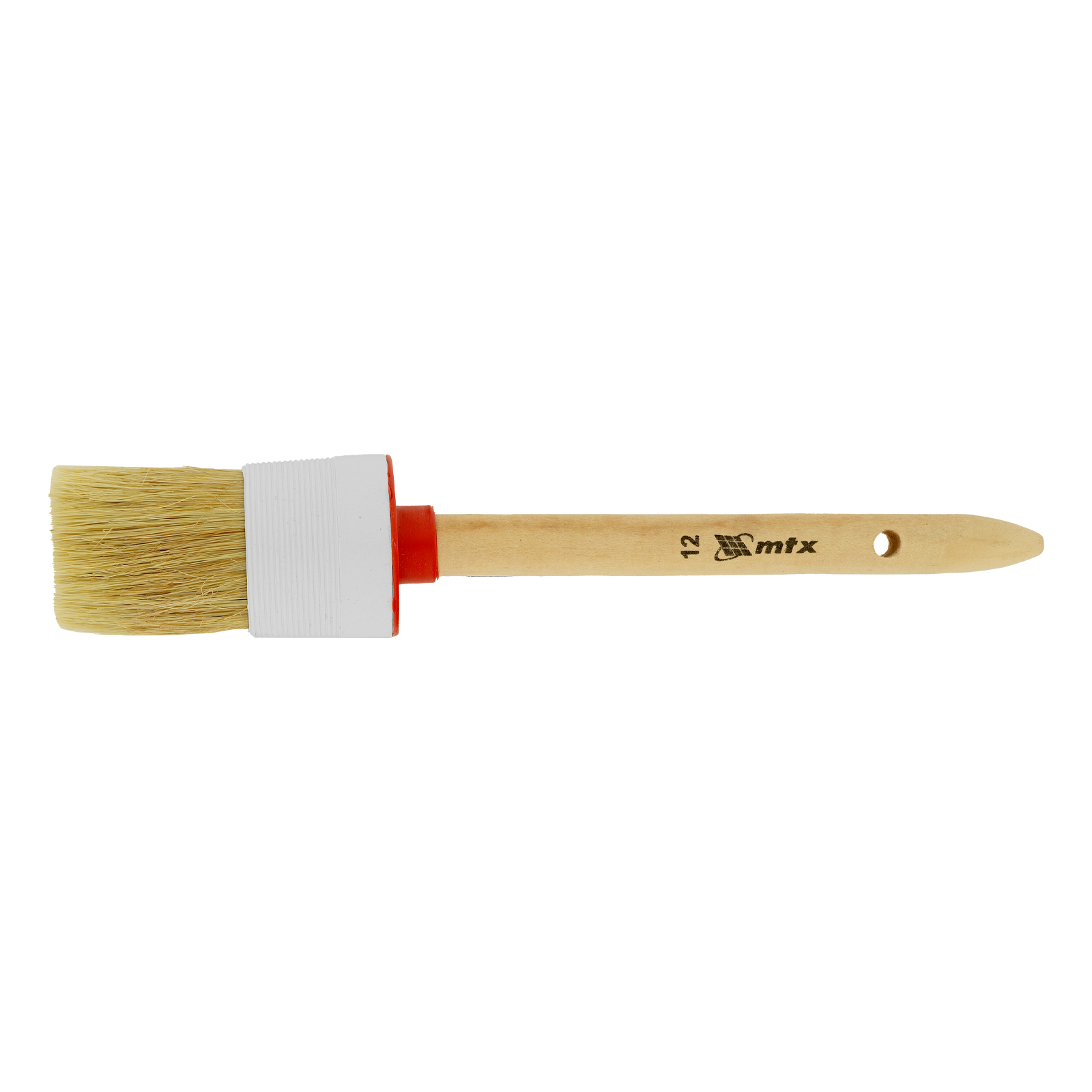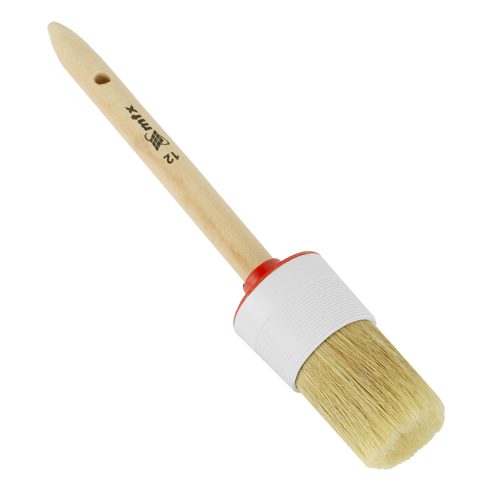 Круглая кисть MTX №12 82082 диаметром 45 мм, с натуральной щетиной и деревянной ручкой, пригодится в быту для окрашивания узких длинных поверхностей. Светлая натуральная свиная щетина с добавлением искусственной обладает высокой износоустойчивостью и может использоваться для нанесения красок с содержанием растворителей, а также масляных красок и лаков.