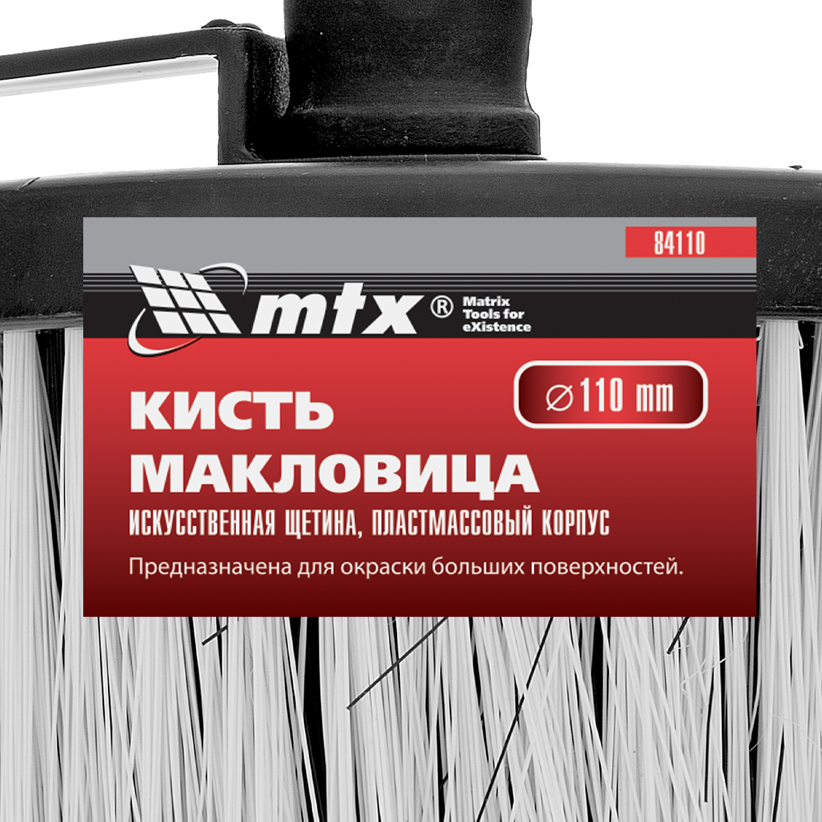 Круглая кисть-макловица MTX 84110 с искусственной щетиной, пластмассовыми корпусом и ручкой, предназначена для нанесения лакокрасочных материалов и клеевых составов на участки большой площади — стены, потолки, фасады. Искусственный ворс не впитывает воду и устойчив к растворителям, поэтому кисть подходит для работ с грунтовками, лаками, водно-дисперсионными и масляными красками.