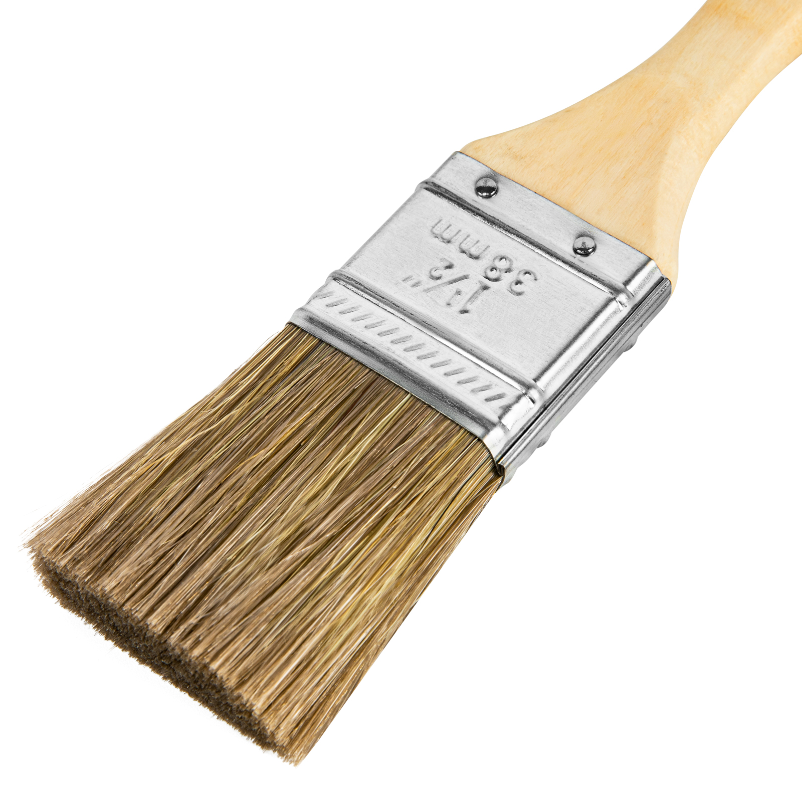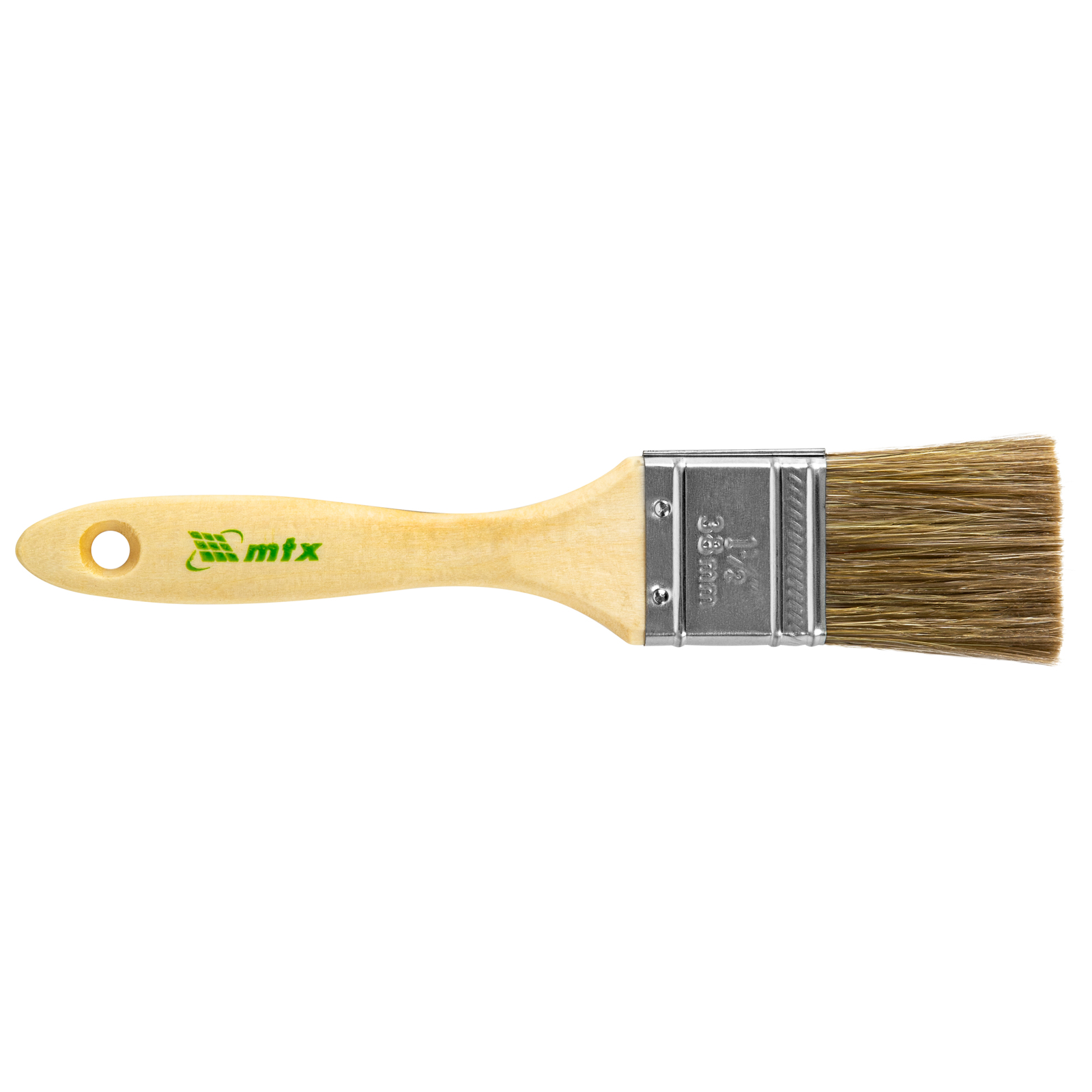 Плоская кисть MTX «Евро» 83078 шириной 1,5", с деревянной ручкой, имеет смешанную щетину и оптимальна для нанесения средств защиты древесины (пропитки, грунтовки, антисептиков, морилки). Сочетает все преимущества искусственной и натуральной щетины благодаря оптимальной комбинации натуральных и искусственных волокон. Обладает высокими краскообменными качествами: благодаря натуральной щетине в составе кисть хорошо впитывает и отдает краску. Инструмент подходит для профессионального использования.