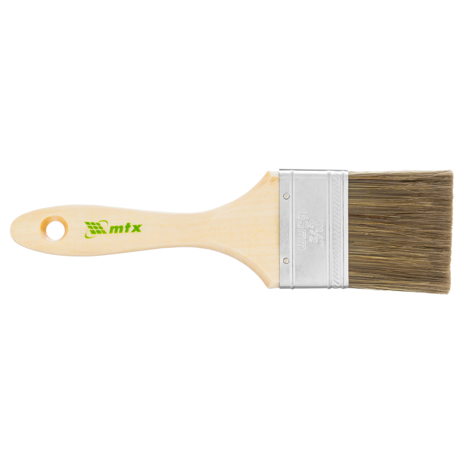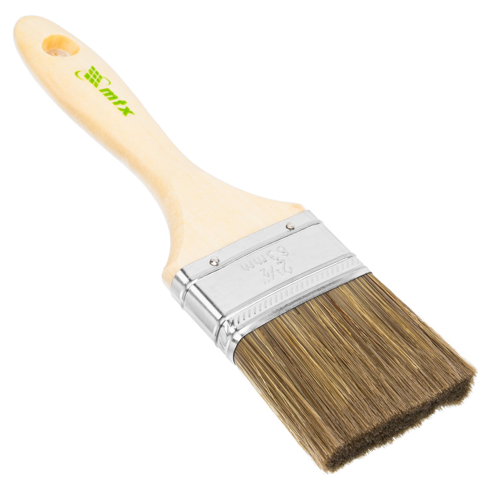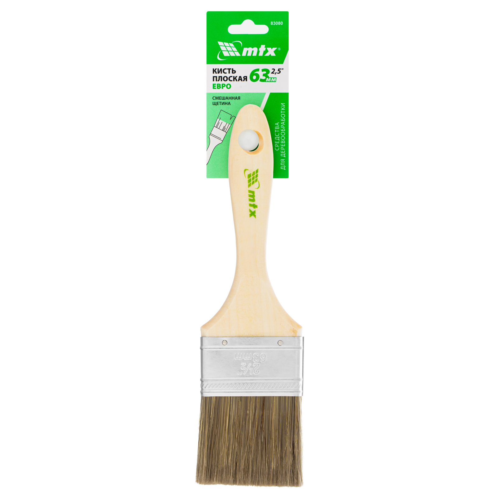 Плоская кисть MTX «Евро» 83080 шириной 2,5", с деревянной ручкой, имеет смешанную щетину и оптимальна для нанесения средств защиты древесины (пропитки, грунтовки, антисептиков, морилки). Сочетает все преимущества искусственной и натуральной щетины благодаря оптимальной комбинации натуральных и искусственных волокон. Обладает высокими краскообменными качествами: благодаря натуральной щетине в составе кисть хорошо впитывает и отдает краску. Инструмент подходит для профессионального использования.