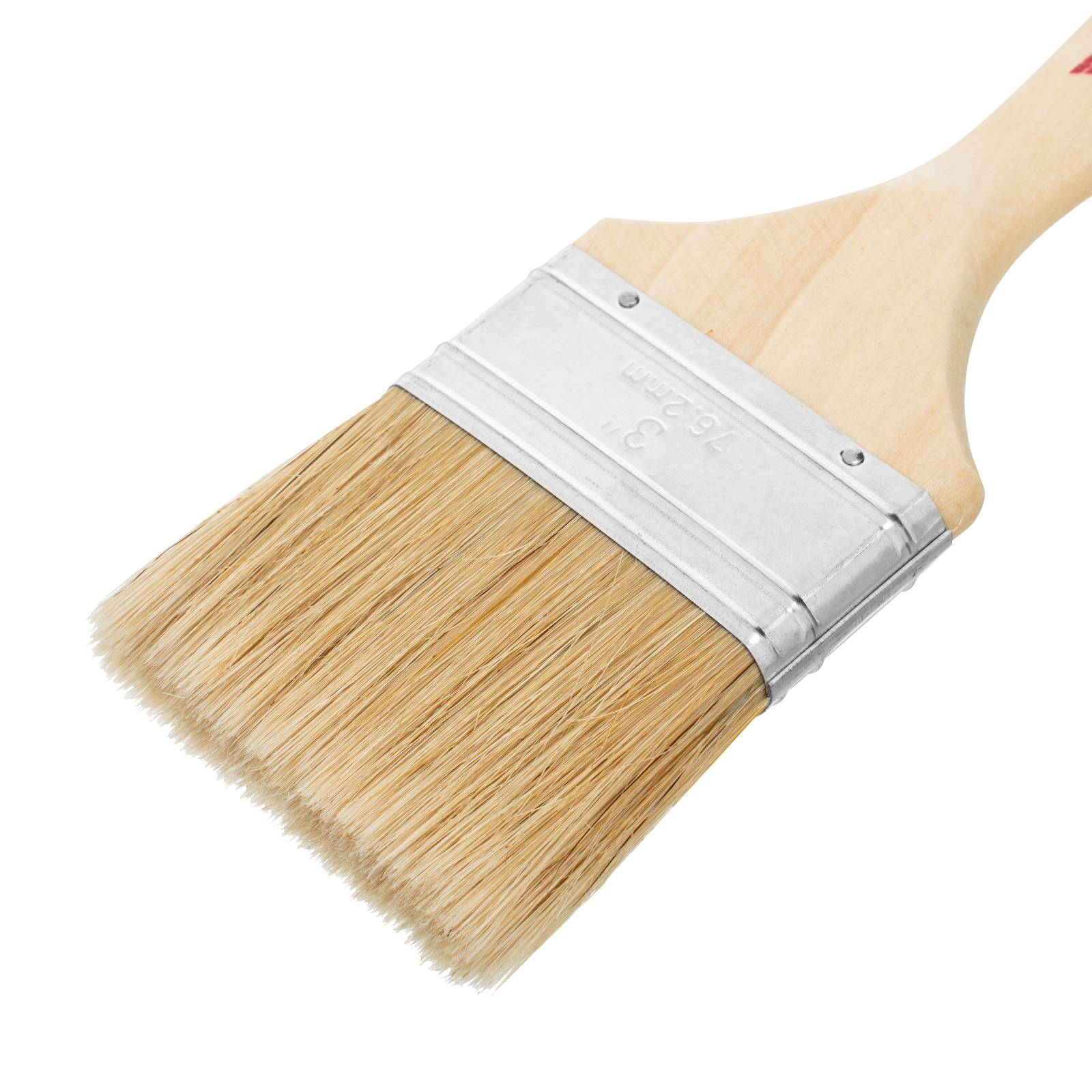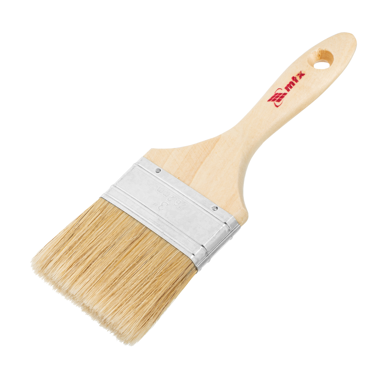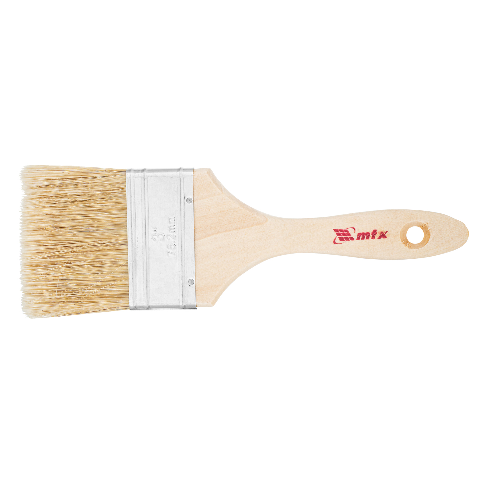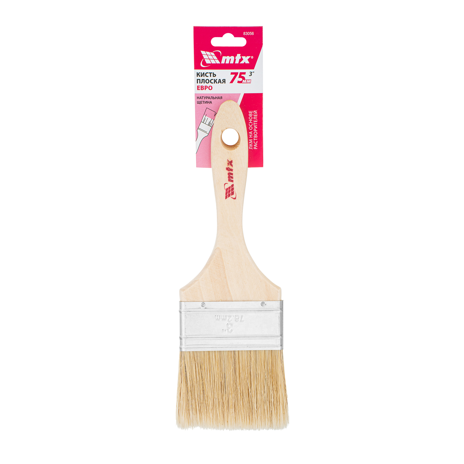 Плоская кисть MTX «Евро» 83056 шириной 3 дюйма, с натуральной щетиной и деревянной ручкой, используется для профессионального окрашивания поверхностей. Рекомендуется для нанесения агрессивных ЛКМ с содержанием растворителей.