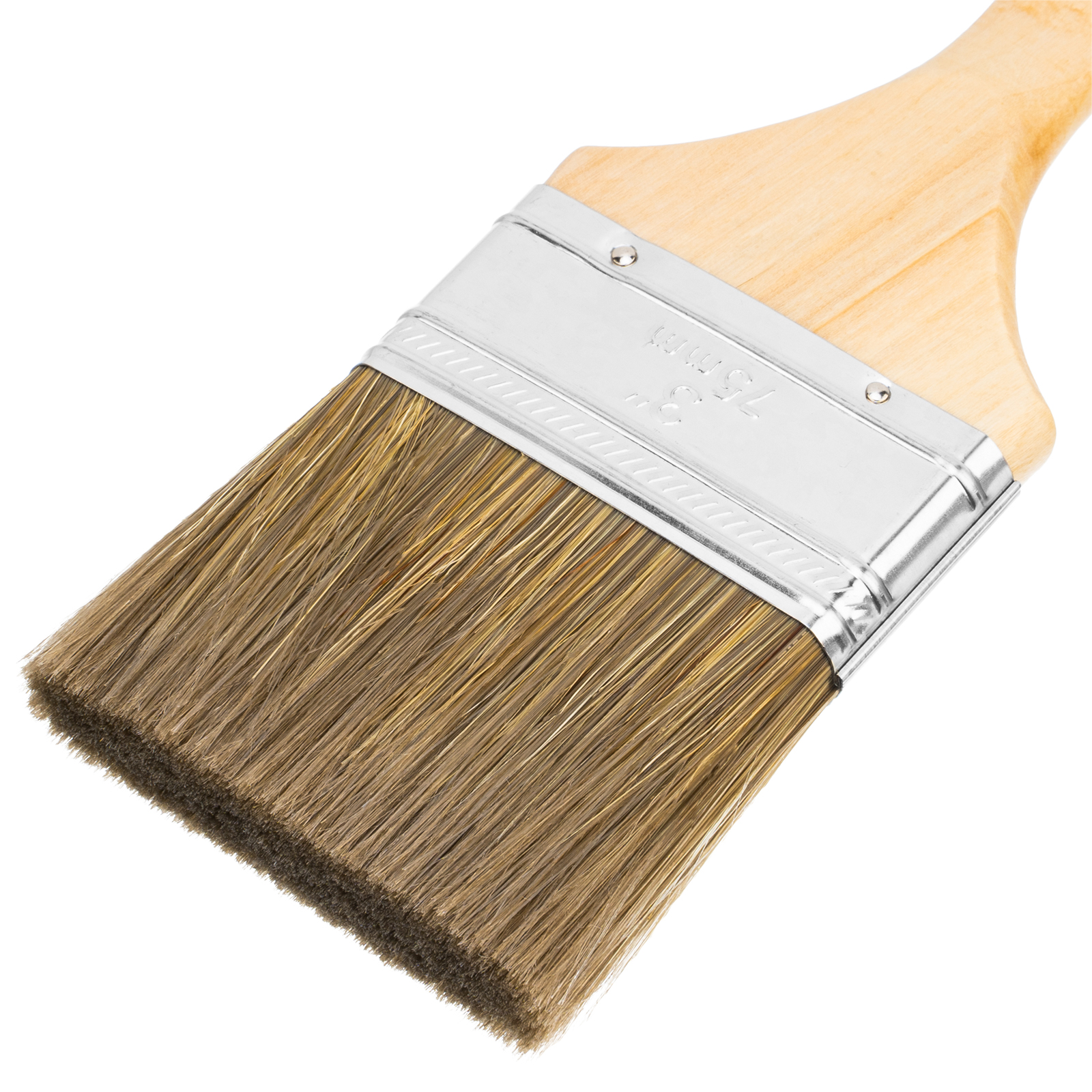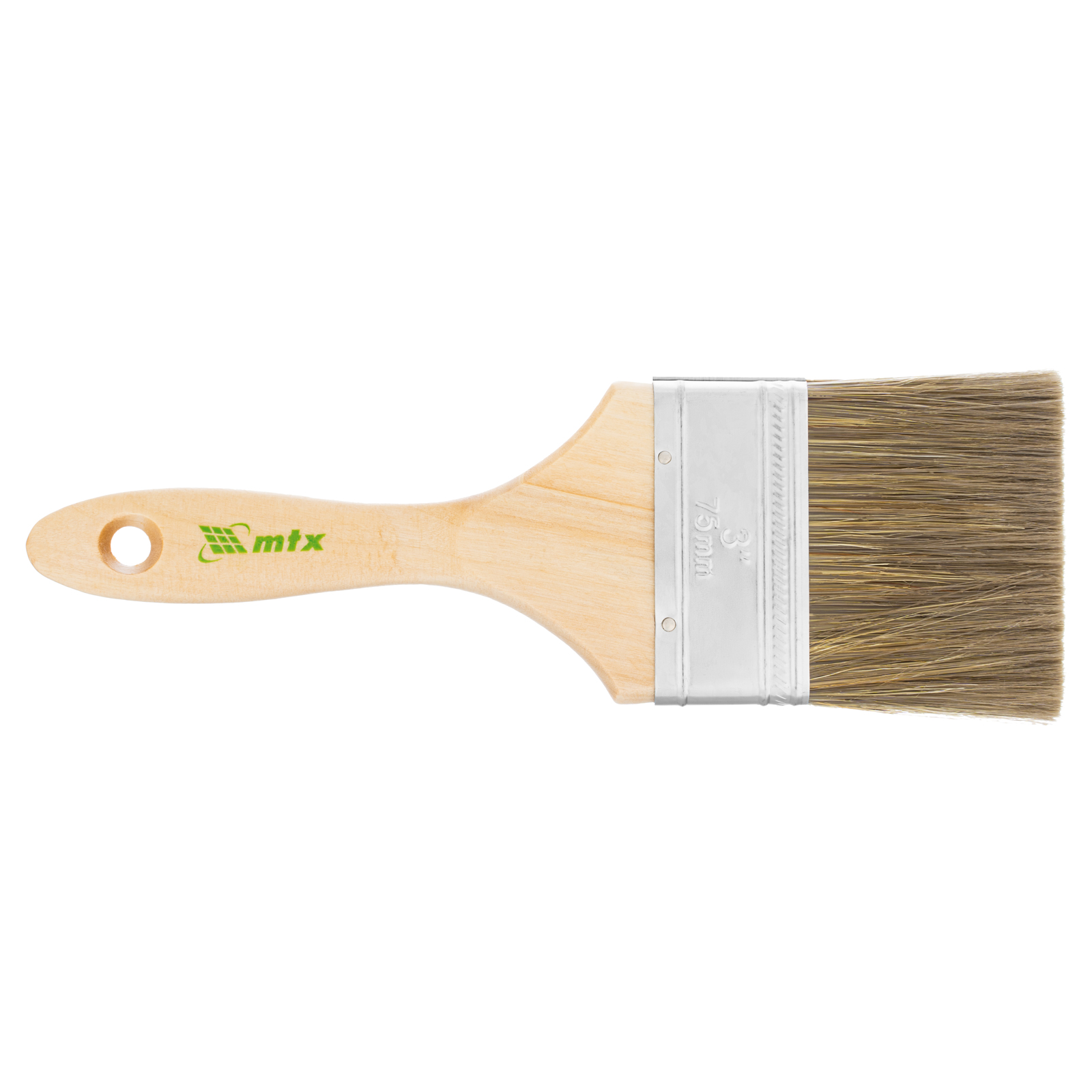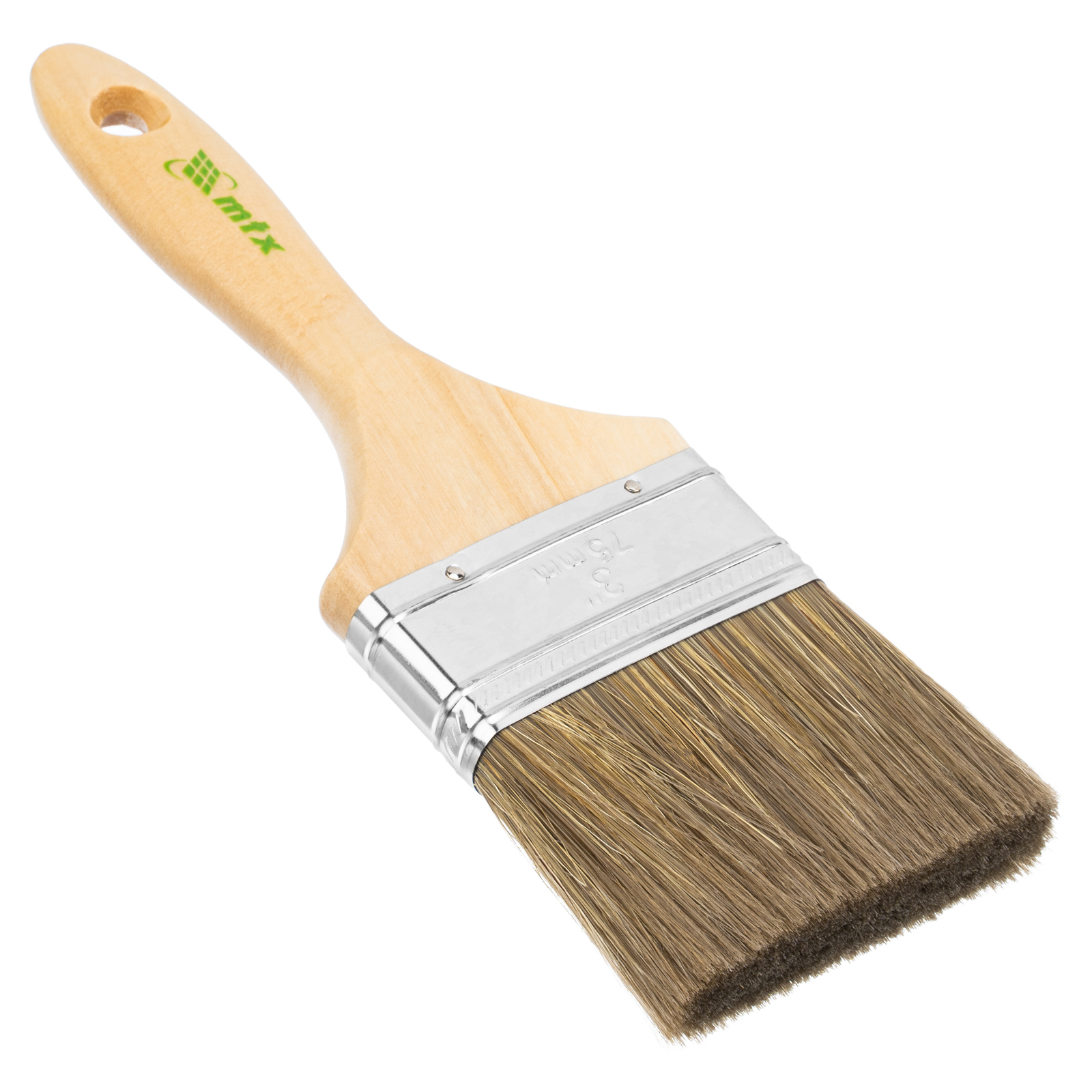 Плоская кисть MTX «Евро» 83081 шириной 3", с деревянной ручкой, имеет смешанную щетину и оптимальна для нанесения средств защиты древесины (пропитки, грунтовки, антисептиков, морилки). Сочетает все преимущества искусственной и натуральной щетины благодаря оптимальной комбинации натуральных и искусственных волокон. Обладает высокими краскообменными качествами: благодаря натуральной щетине в составе кисть хорошо впитывает и отдает краску. Инструмент подходит для профессионального использования.