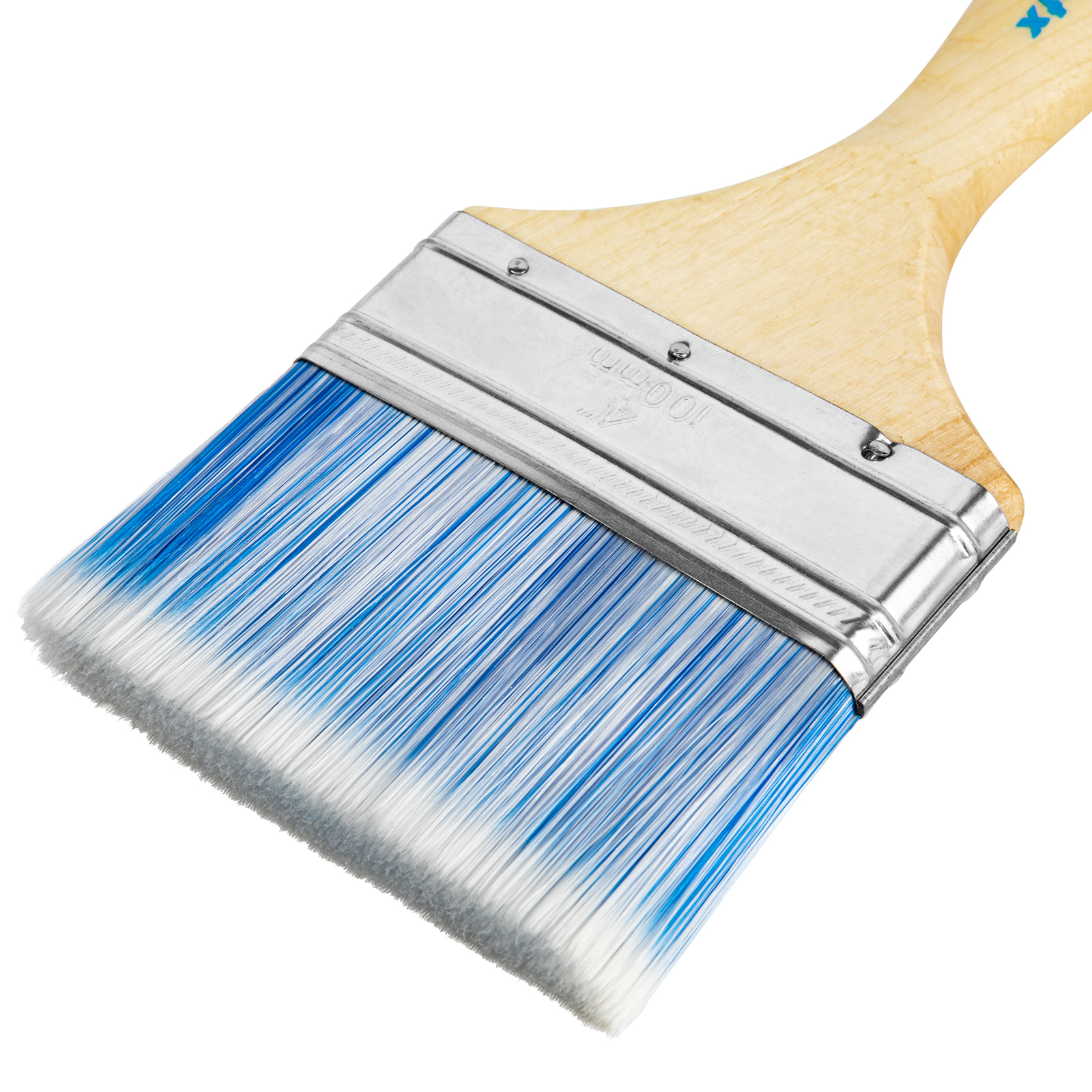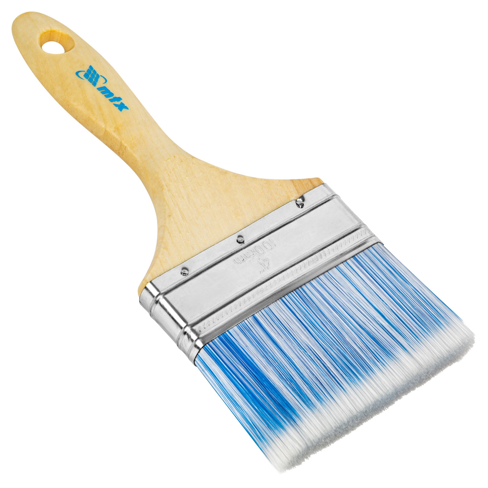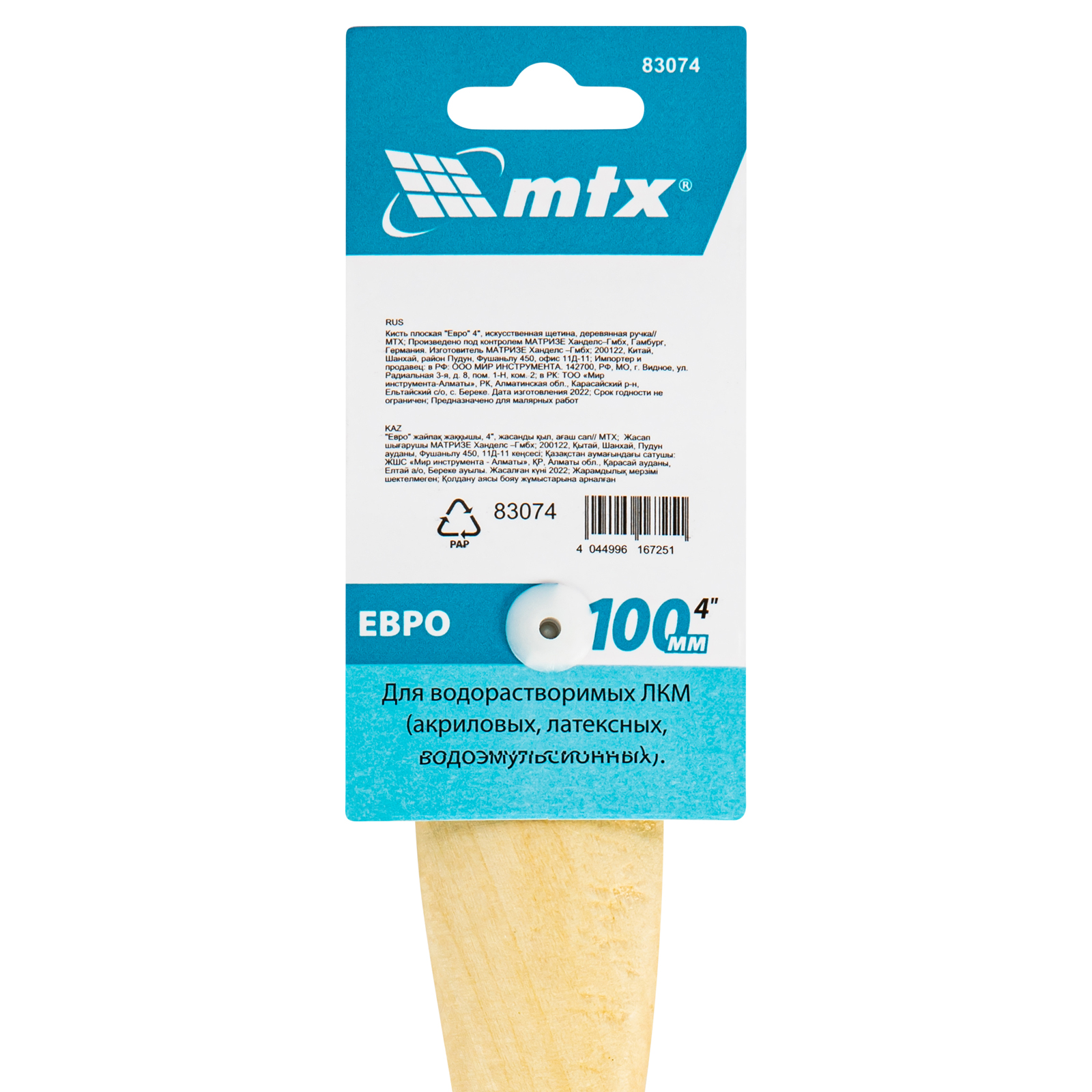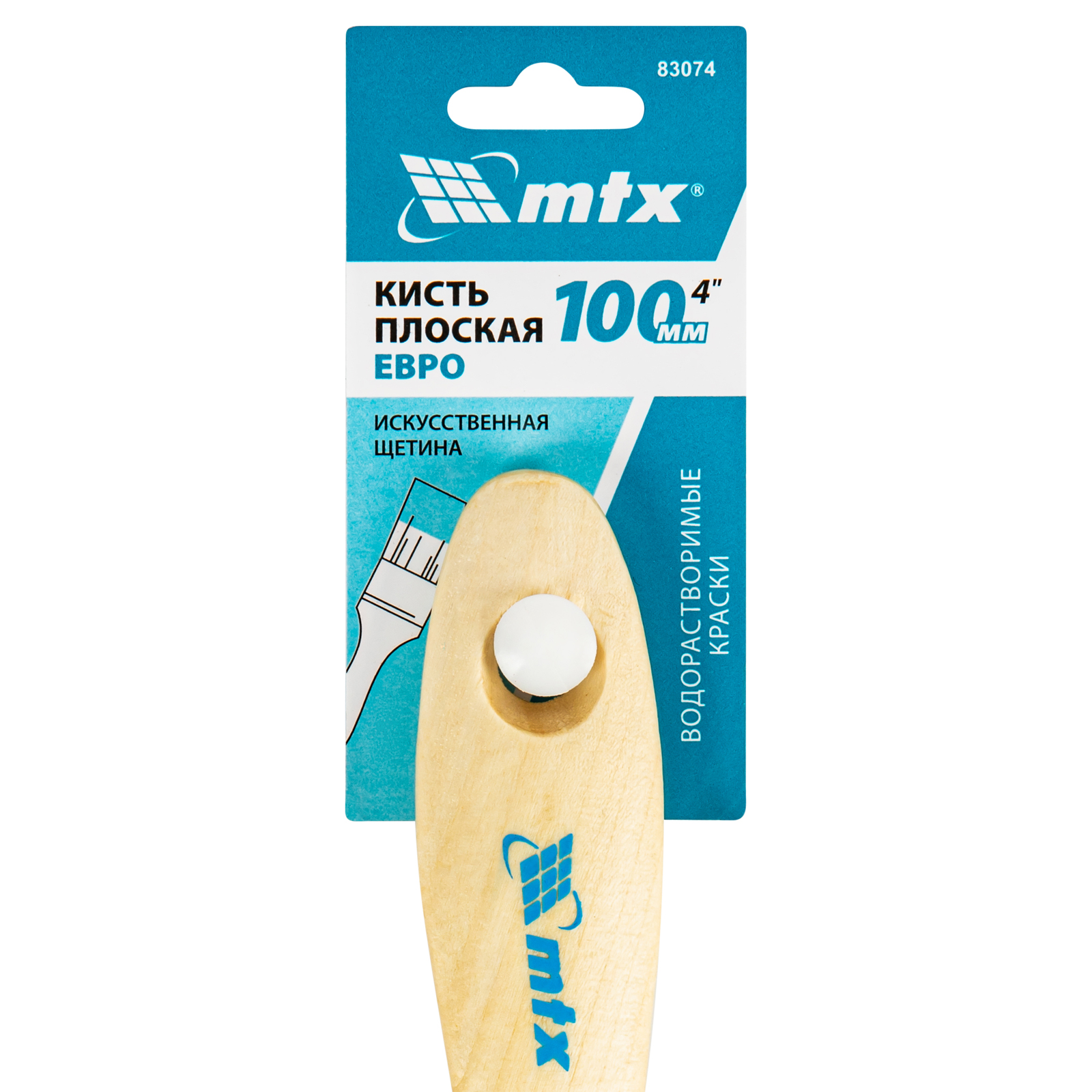 Плоская кисть MTX «Евро» 83074 шириной 4", с искусственной щетиной и деревянной ручкой, предназначена для малярных работ. Оптимальна для работы с водорастворимыми ЛКМ (акриловыми, латексными, водоэмульсионными), удобна для обработки участков небольшой площади. Кисть подходит для профессионального использования.
