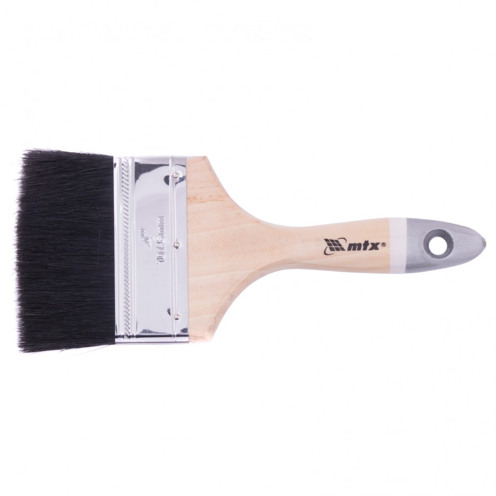 Плоская кисть MTX 82643 шириной 4 дюйма, с натуральной черной щетиной и деревянной ручкой, применяется при проведении малярных работ как внутри, так и снаружи помещений. Жесткая и упругая щетина отличается повышенной износостойкостью, что позволяет использовать кисть для окрашивания грубых поверхностей красками на агрессивной основе: масляными и с содержанием растворителей.